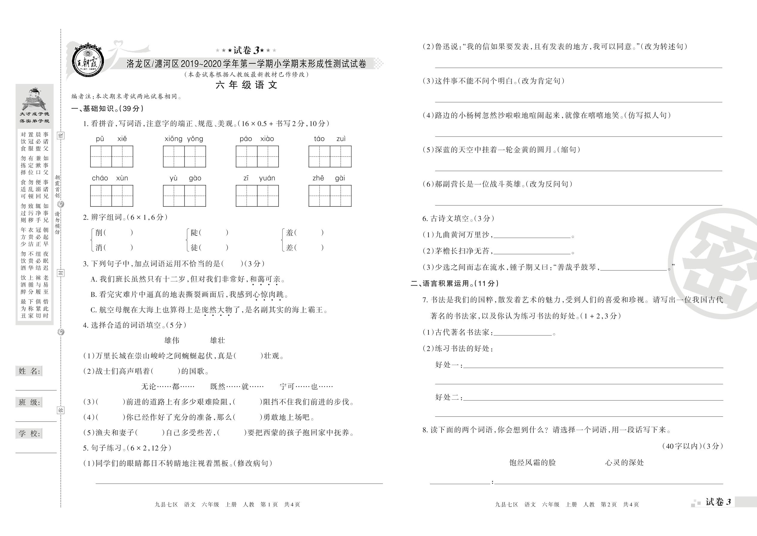 2019-2020学年第一学期洛阳市洛龙区、瀍河区六年级语文试卷(人教版)【3】
