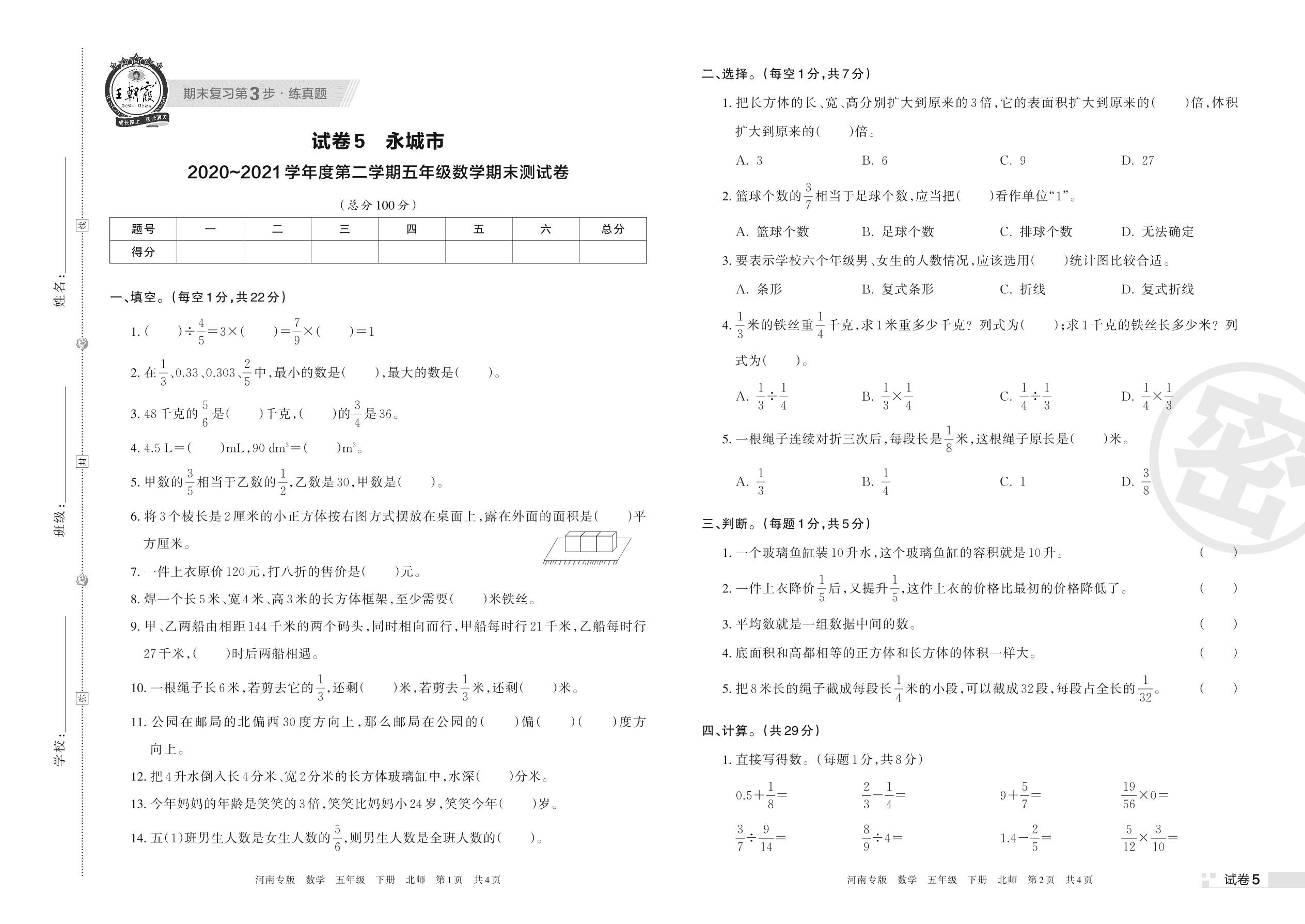 永城市2020~2021学年度第二学期五年级数学期末测试卷(北师版)【5】