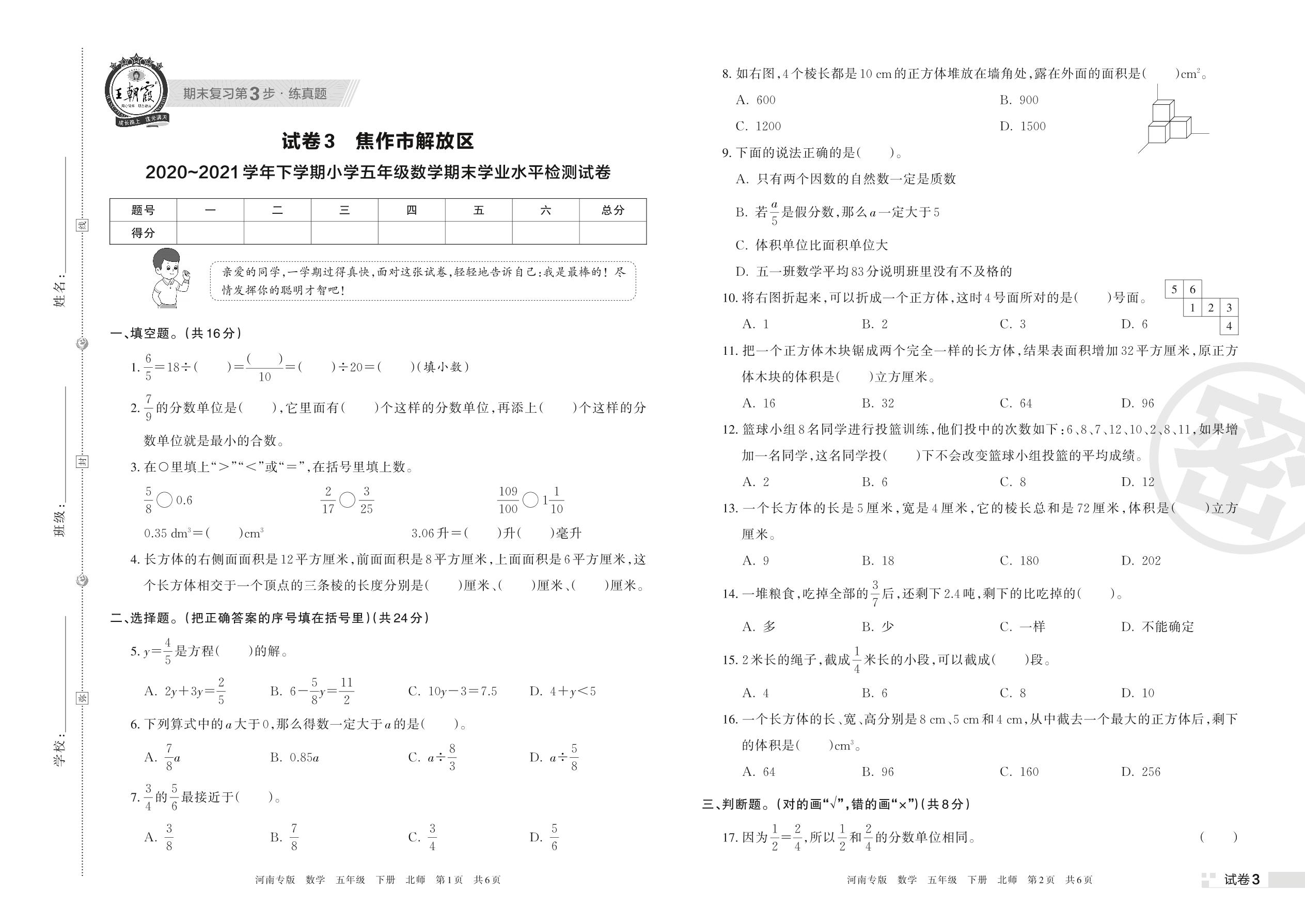 焦作市解放区2020~2021学年下学期小学五年级数学期末学业水平检测试卷(北师版)【3】