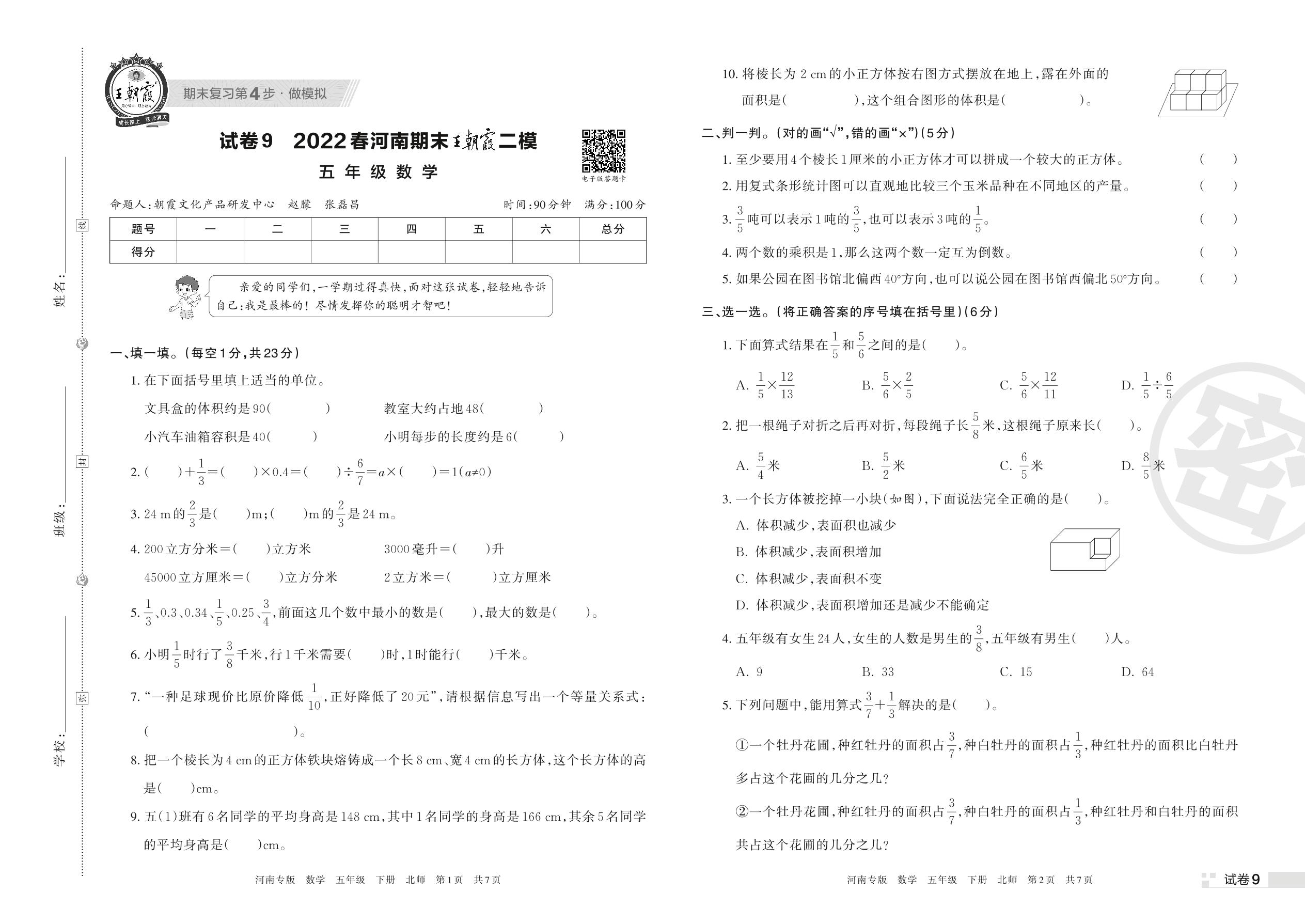 王朝霞期末模拟卷五年级下册数学(北师版)【9】