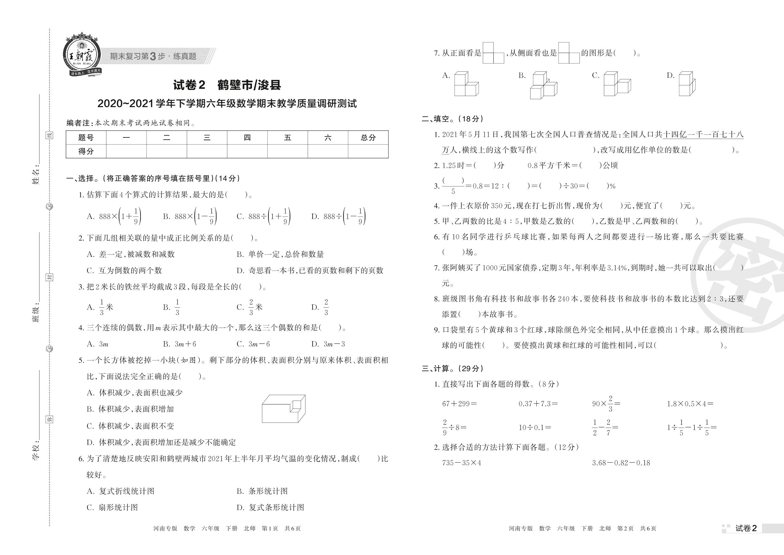 鹤壁市、浚县2020~2021学年下学期六年级数学期末教学质量调研测试(北师版)【2】