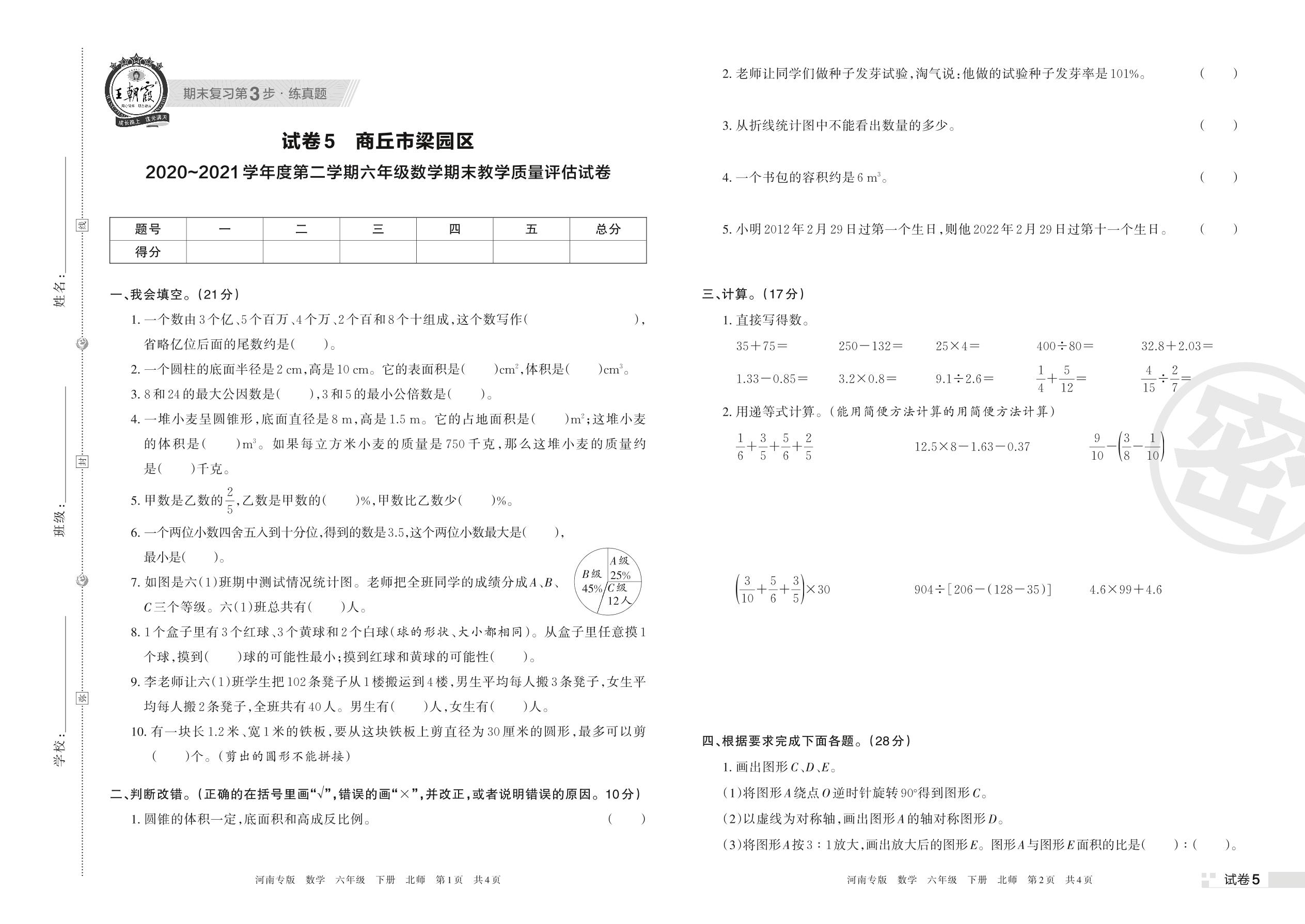 商丘市梁园区2020~2021学年度第二学期六年级数学期末教学质量评估试卷(北师版)【5】