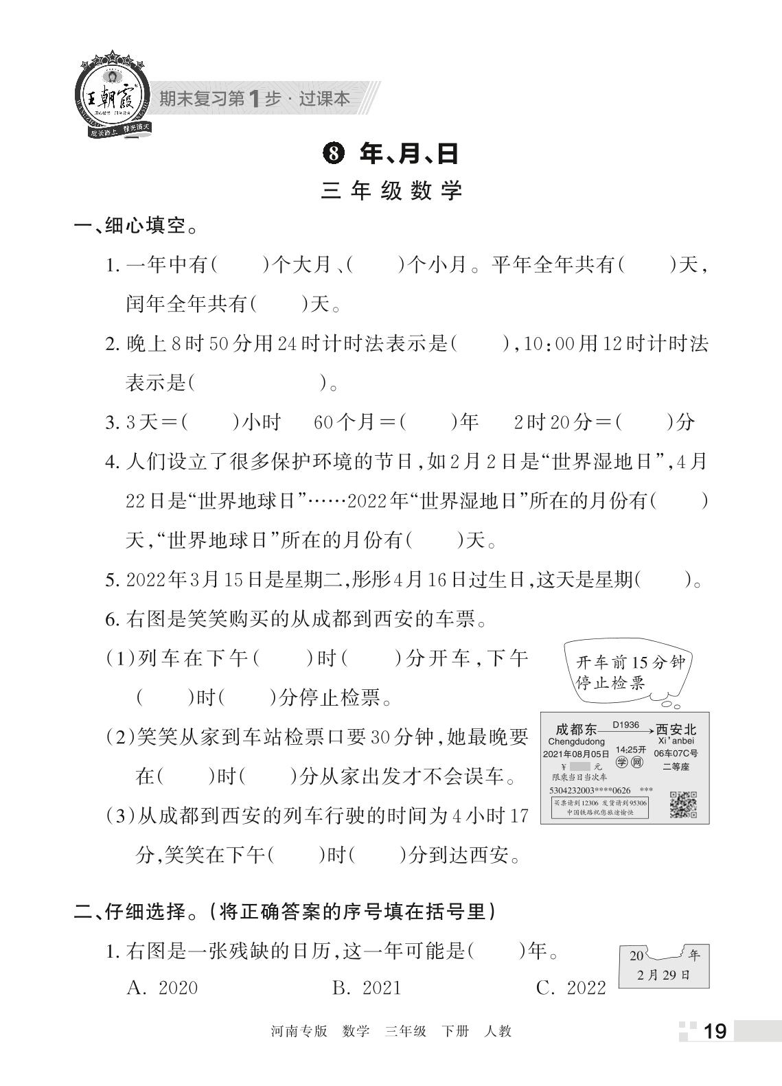 王朝霞期末过课本——8 年、月、日三年级下册数学(人教版)_R220329160939062