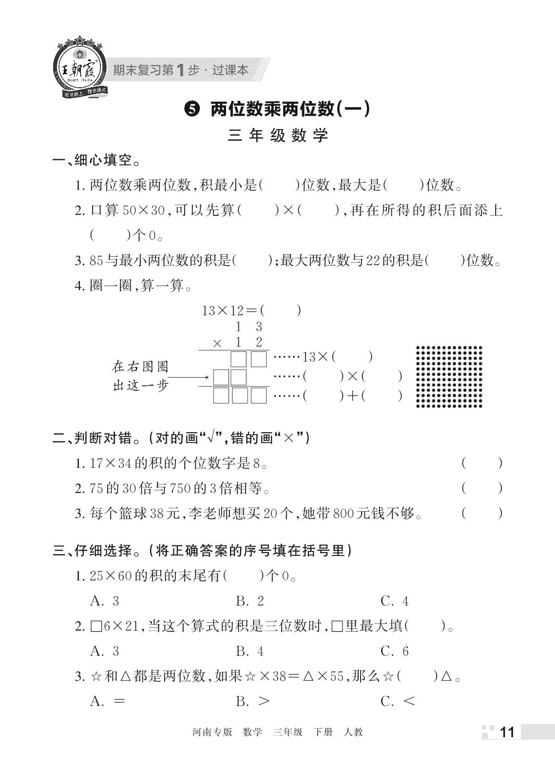 王朝霞期末过课本——5 两位数乘两位数(一)三年级下册数学(人教版)_R220329160939333