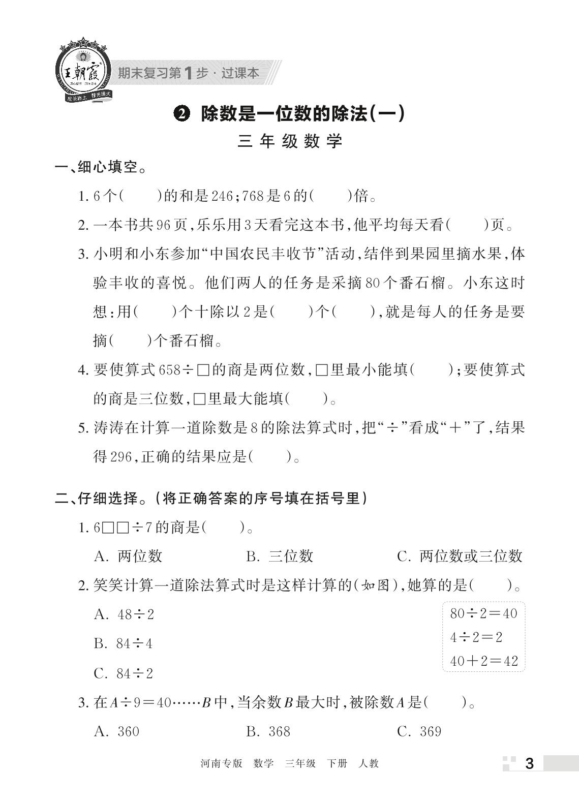 王朝霞期末过课本——2 除数是一位数的除法(一)三年级下册数学(人教版)_R220329160939822