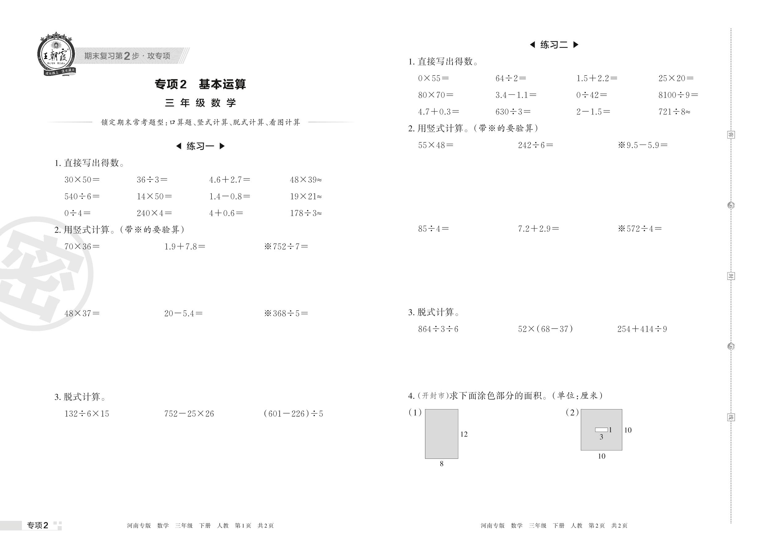 王朝霞期末专项卷——基本运算三年级下册数学(人教版)_R220329160940689【2】