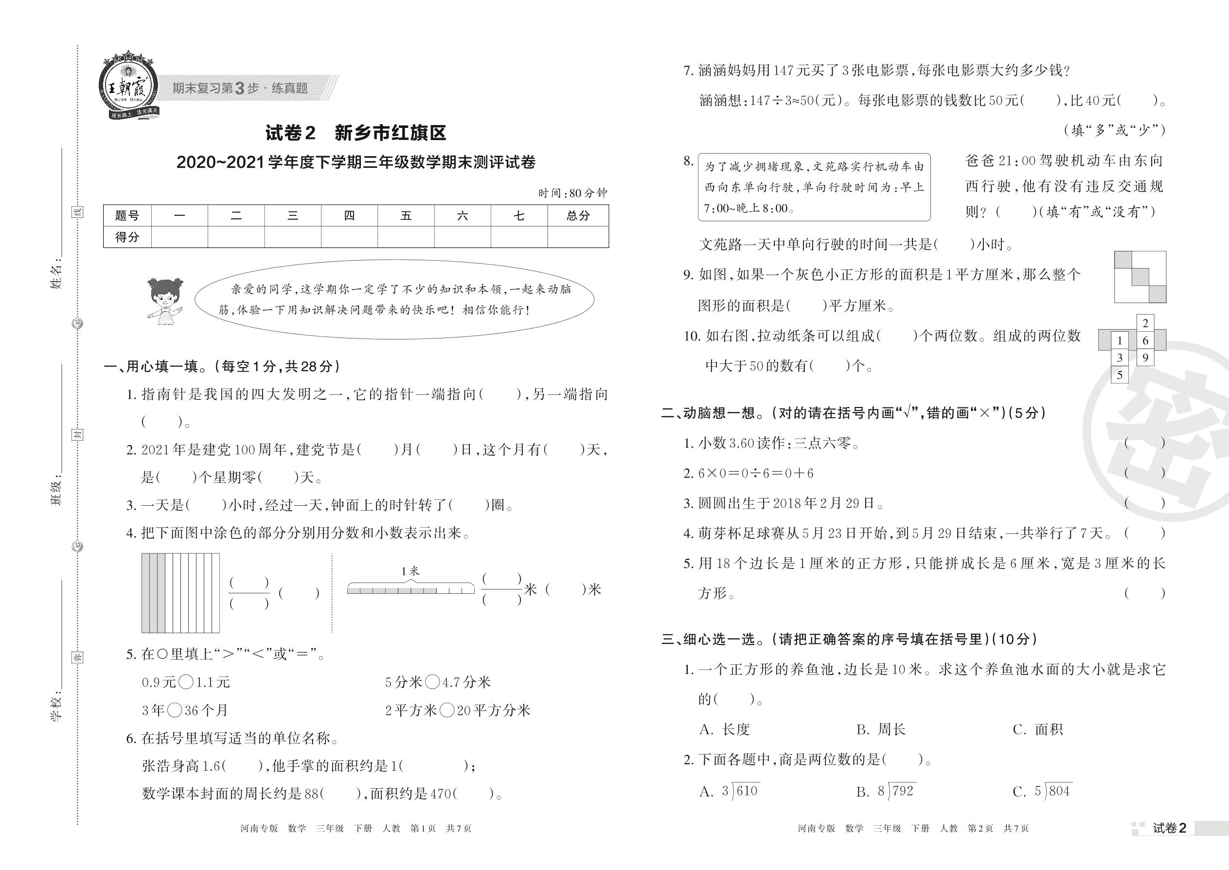 新乡市红旗区2020~2021学年度下学期三年级数学期末测评试卷(人教版)【2】