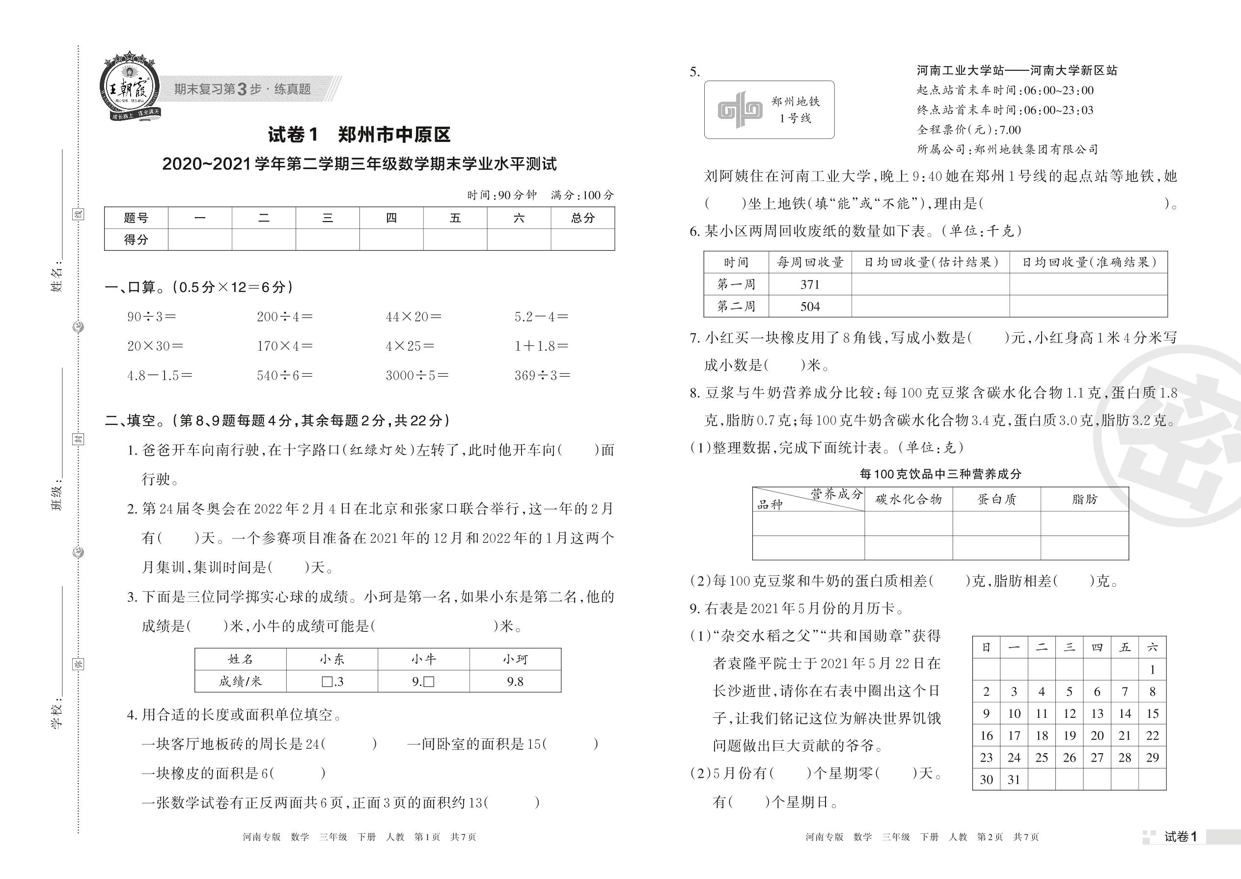 郑州市中原区2020~2021学年第二学期三年级数学期末学业水平测试(人教版)【1】