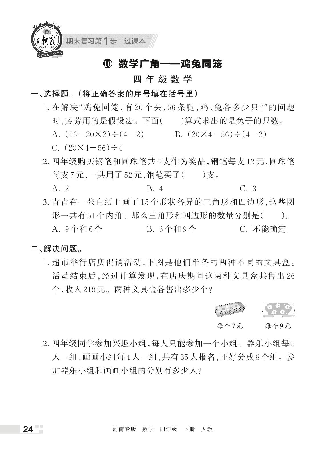 王朝霞期末过课本——10 数学广角:鸡兔同笼四年级下册数学(人教版)_R220329161647151