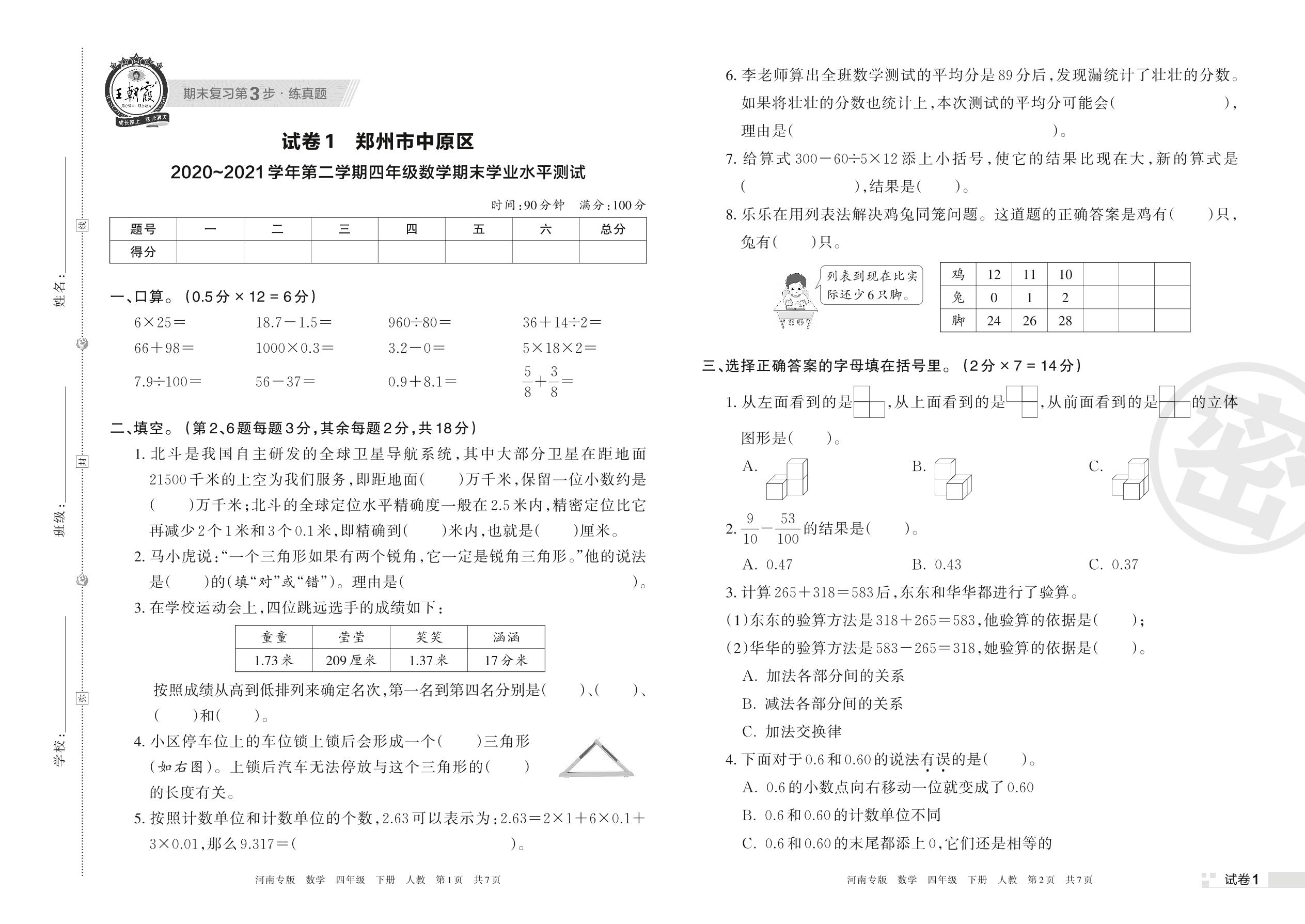 郑州市中原区2020~2021学年第二学期四年级数学期末学业水平测试(人教版)【1】