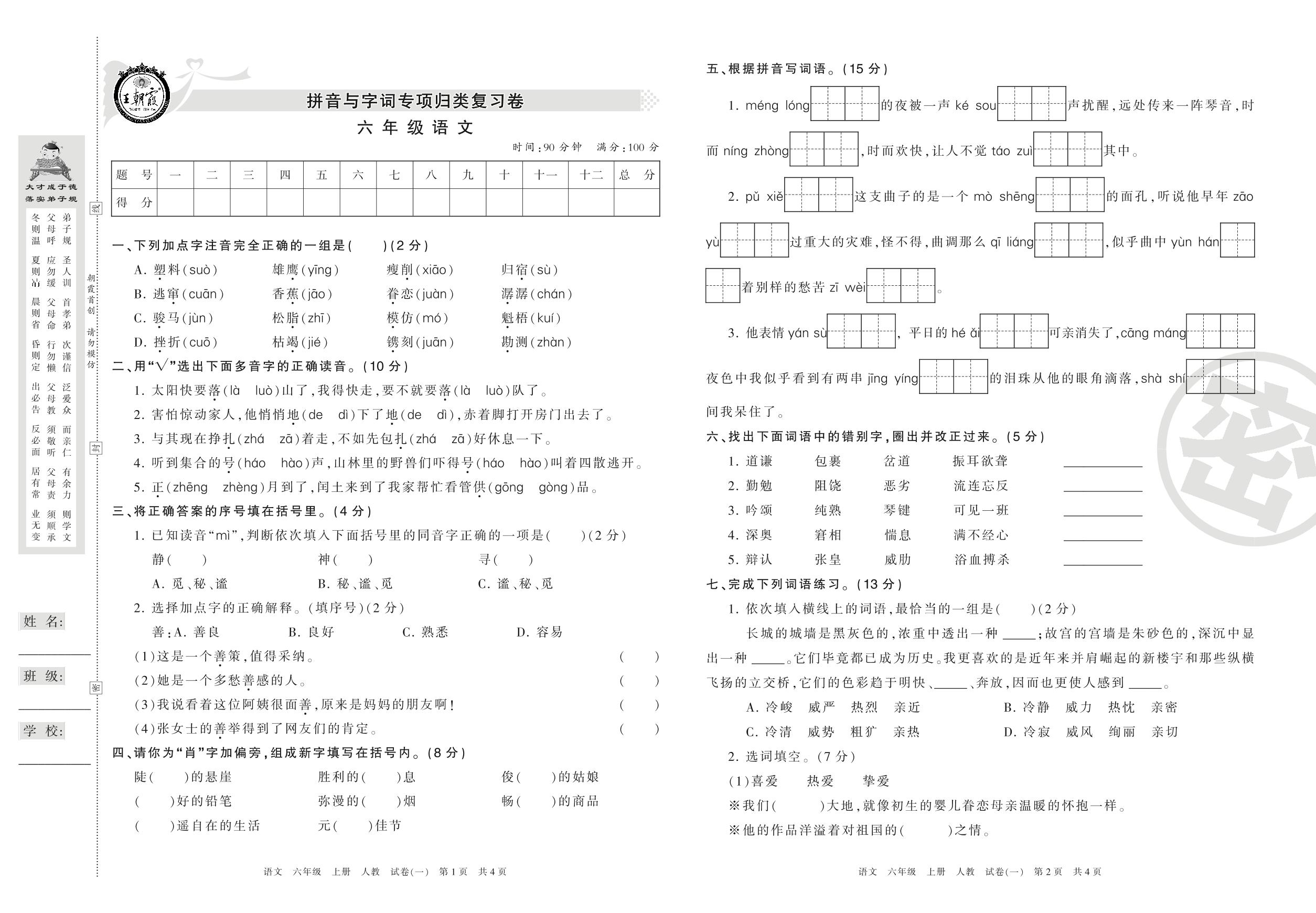 王朝霞期末专项卷——拼音与字词专项归类复习六年级上册语文(人教版)【1】