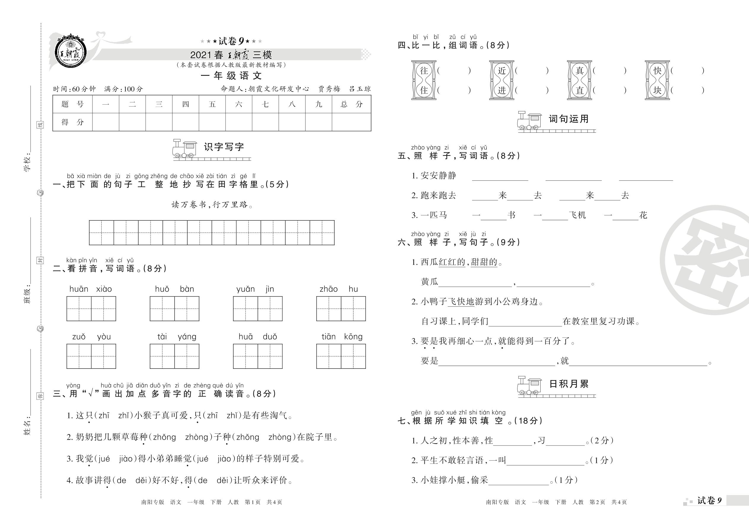 王朝霞期末模拟卷一年级下册语文(人教版)_R210731173144【9】