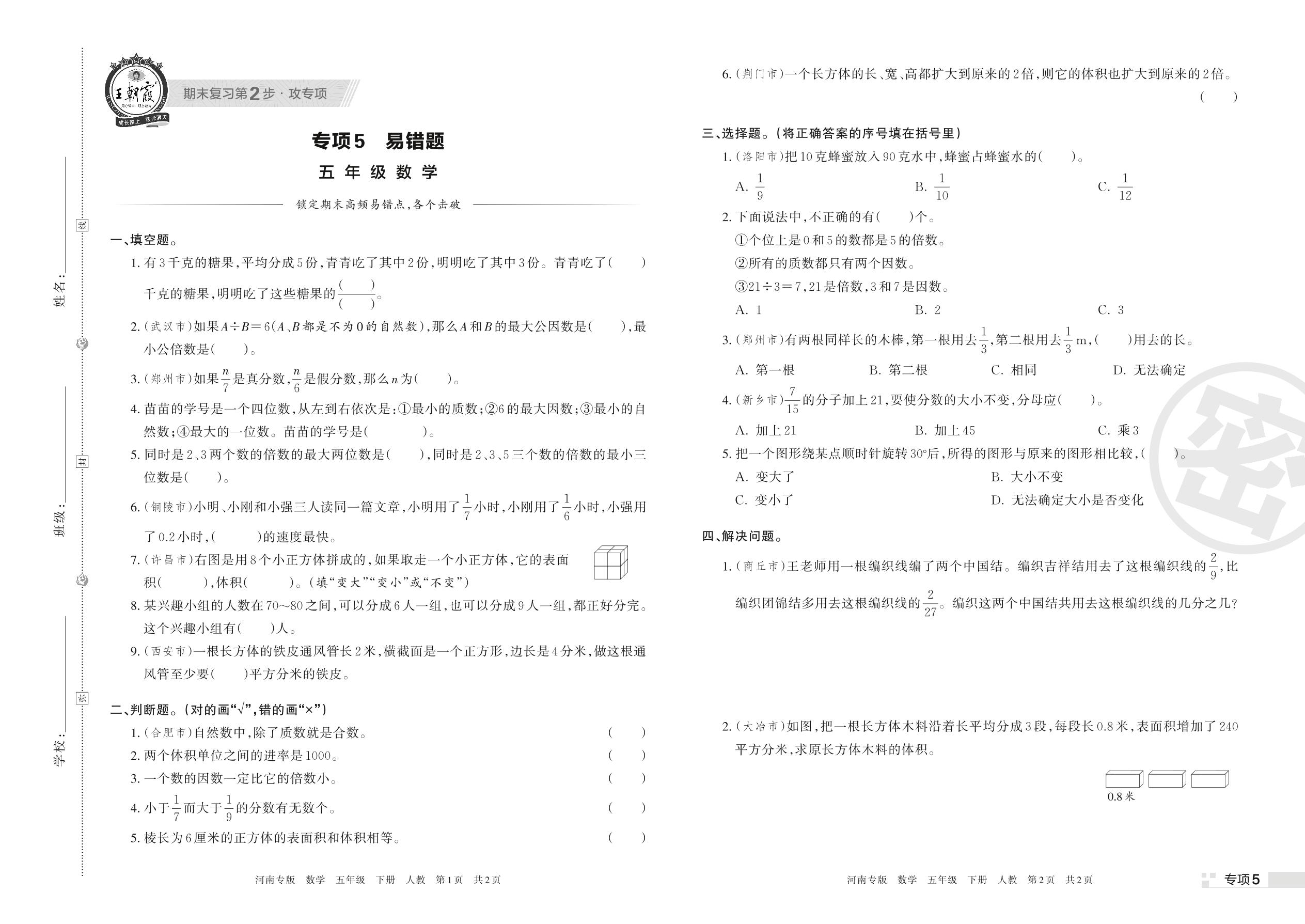 王朝霞期末专项卷——易错题五年级下册数学(人教版)_R220329162419159【5】