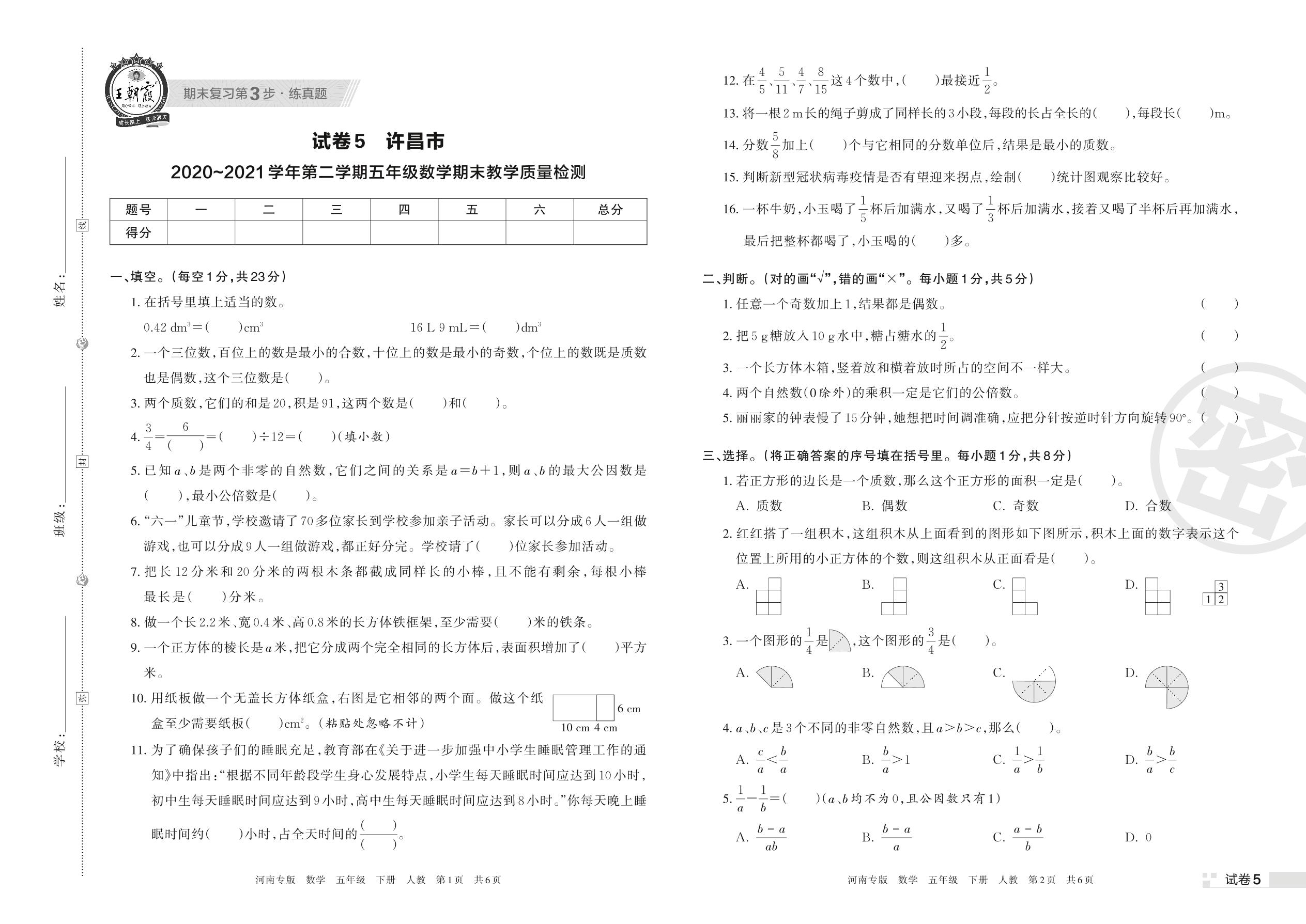 许昌市2020~2021学年第二学期五年级数学期末教学质量检测(人教版)【5】