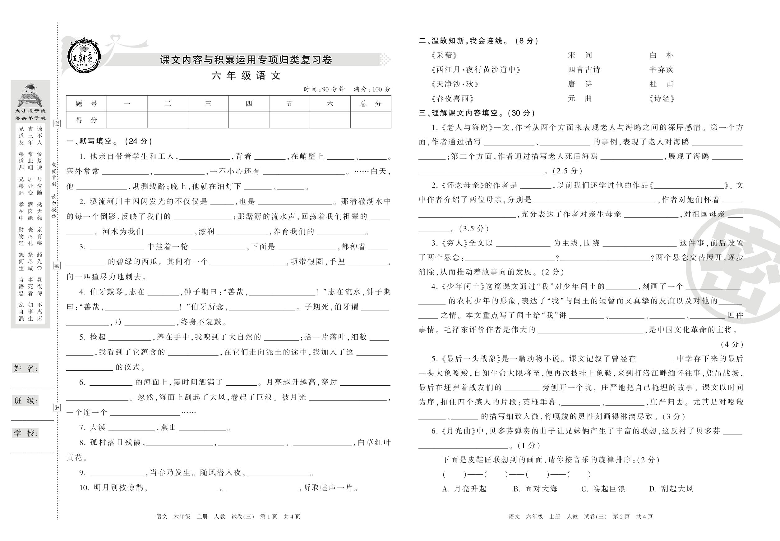 王朝霞期末专项卷——课文内容与积累运用专项归类复习六年级上册语文(人教版)【3】