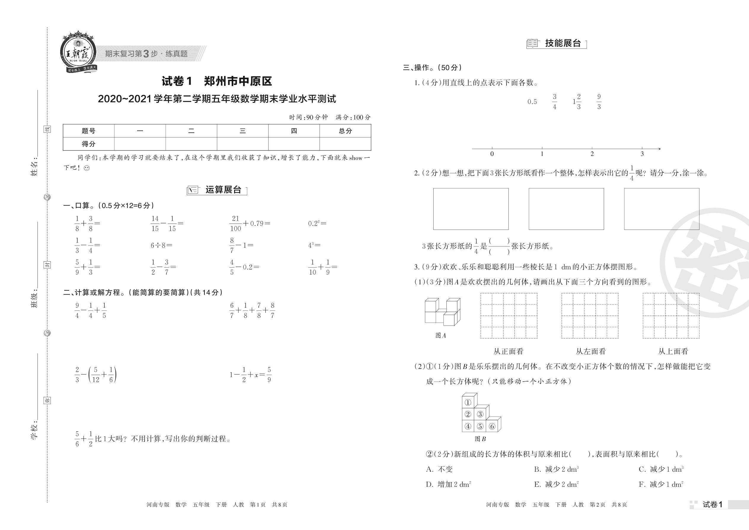 郑州市中原区2020~2021学年第二学期五年级数学期末学业水平测试(人教版)【1】