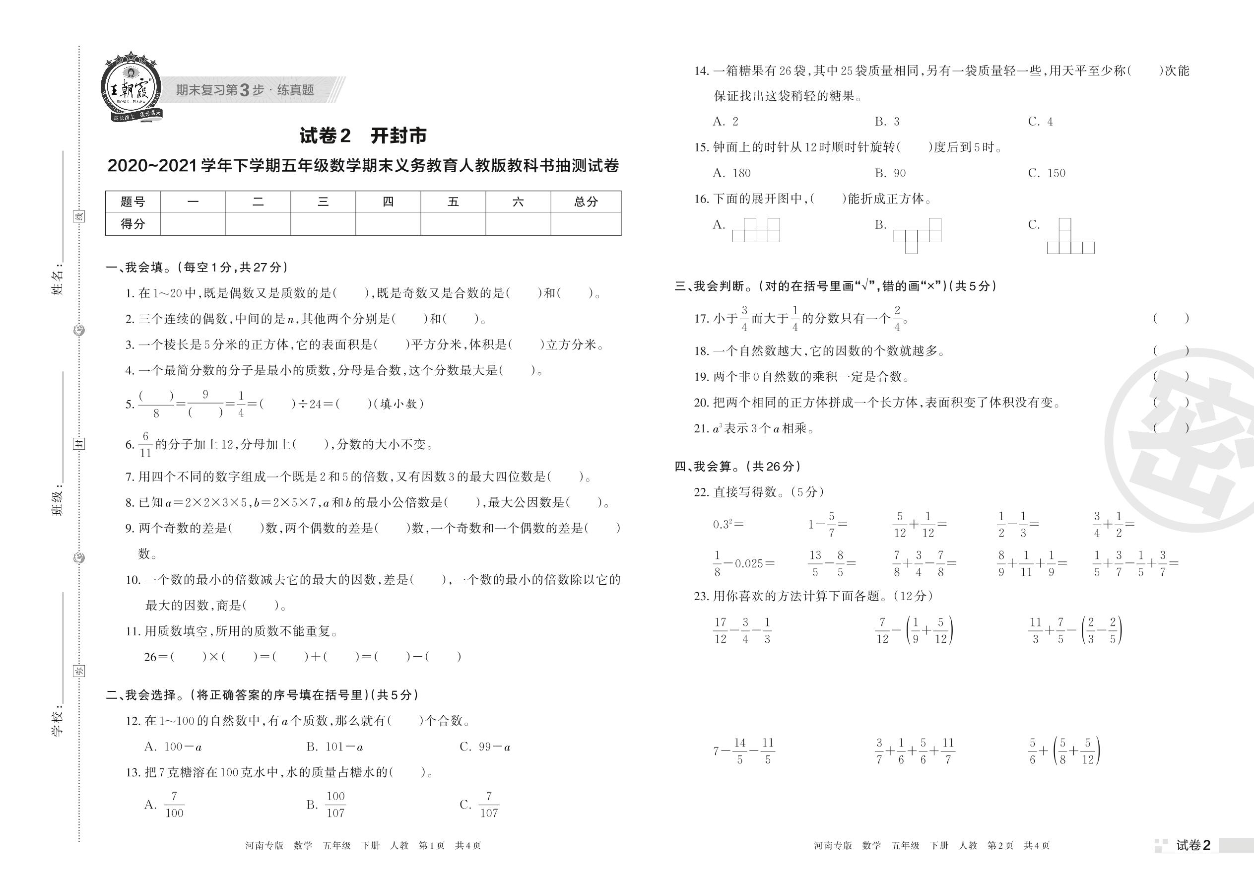 开封市2020~2021学年下学期五年级数学期末义务教育人教版教科书抽测试卷(人教版)【2】