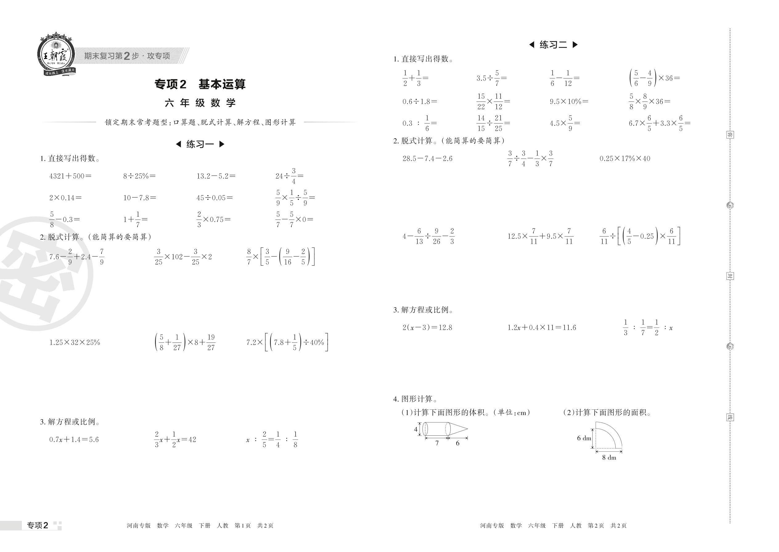 王朝霞期末专项卷——基本运算六年级下册数学(人教版)_R220329163329742【2】