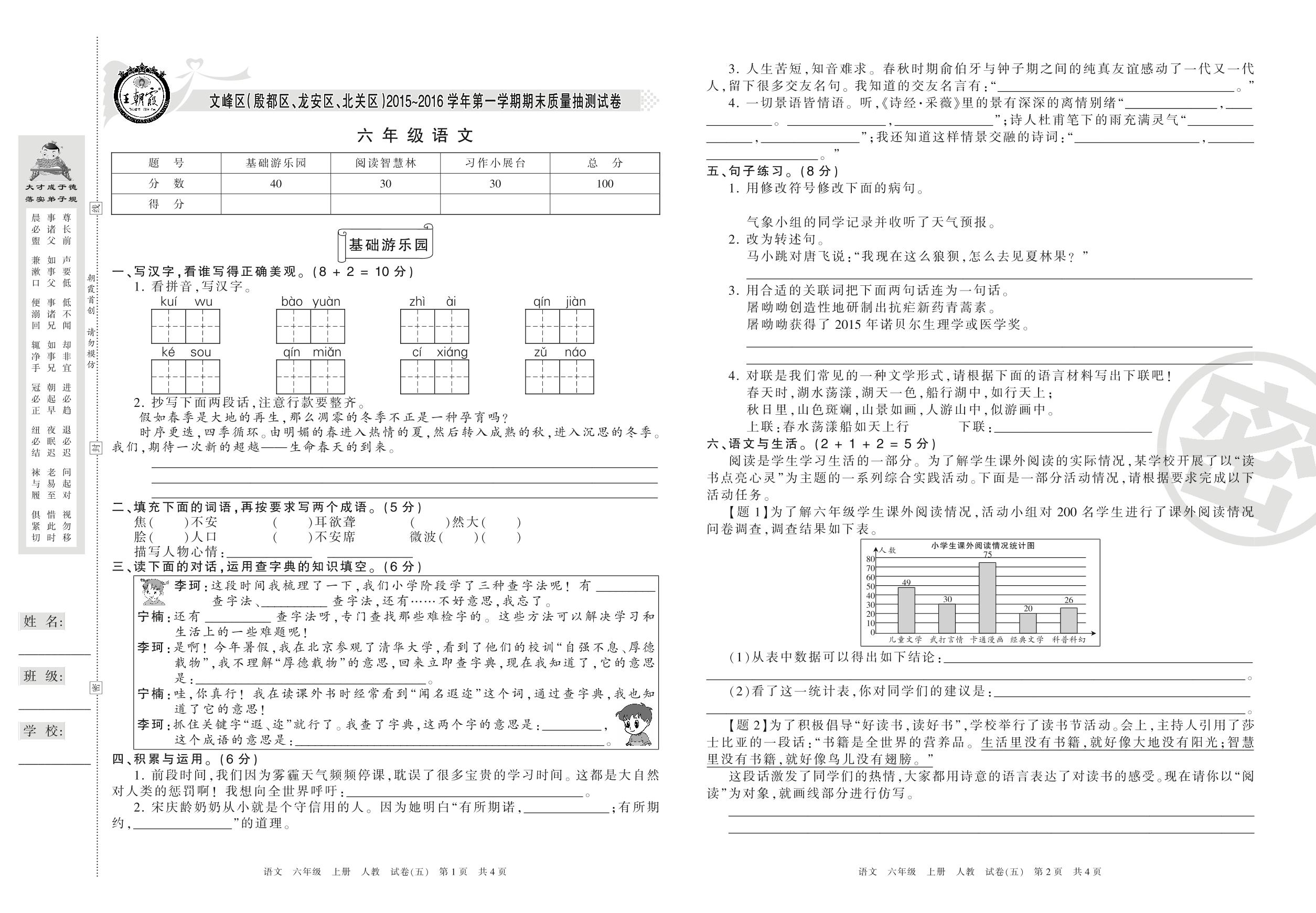 2015-2016学年第一学期安阳市文峰区(殷都区、龙安区、北关区)六年级语文试卷(人教版)【5】