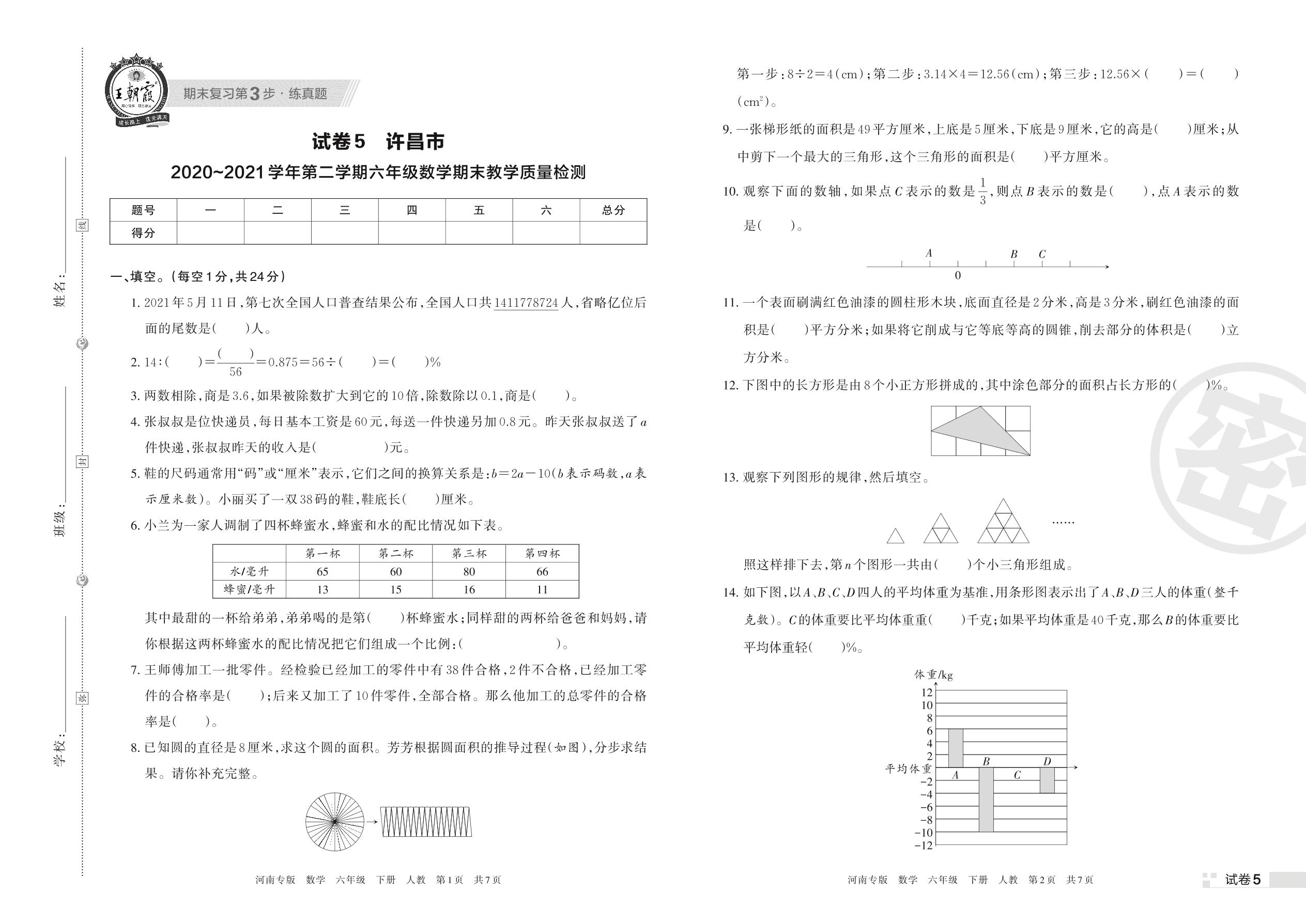 许昌市2020~2021学年第二学期六年级数学期末教学质量检测(人教版)【5】