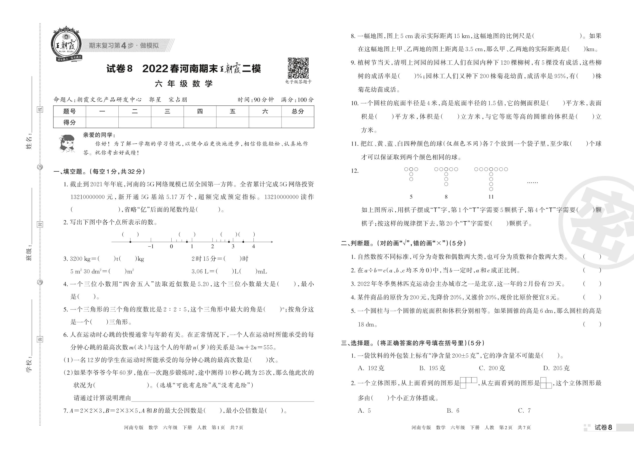 王朝霞期末模拟卷六年级下册数学(人教版)【8】