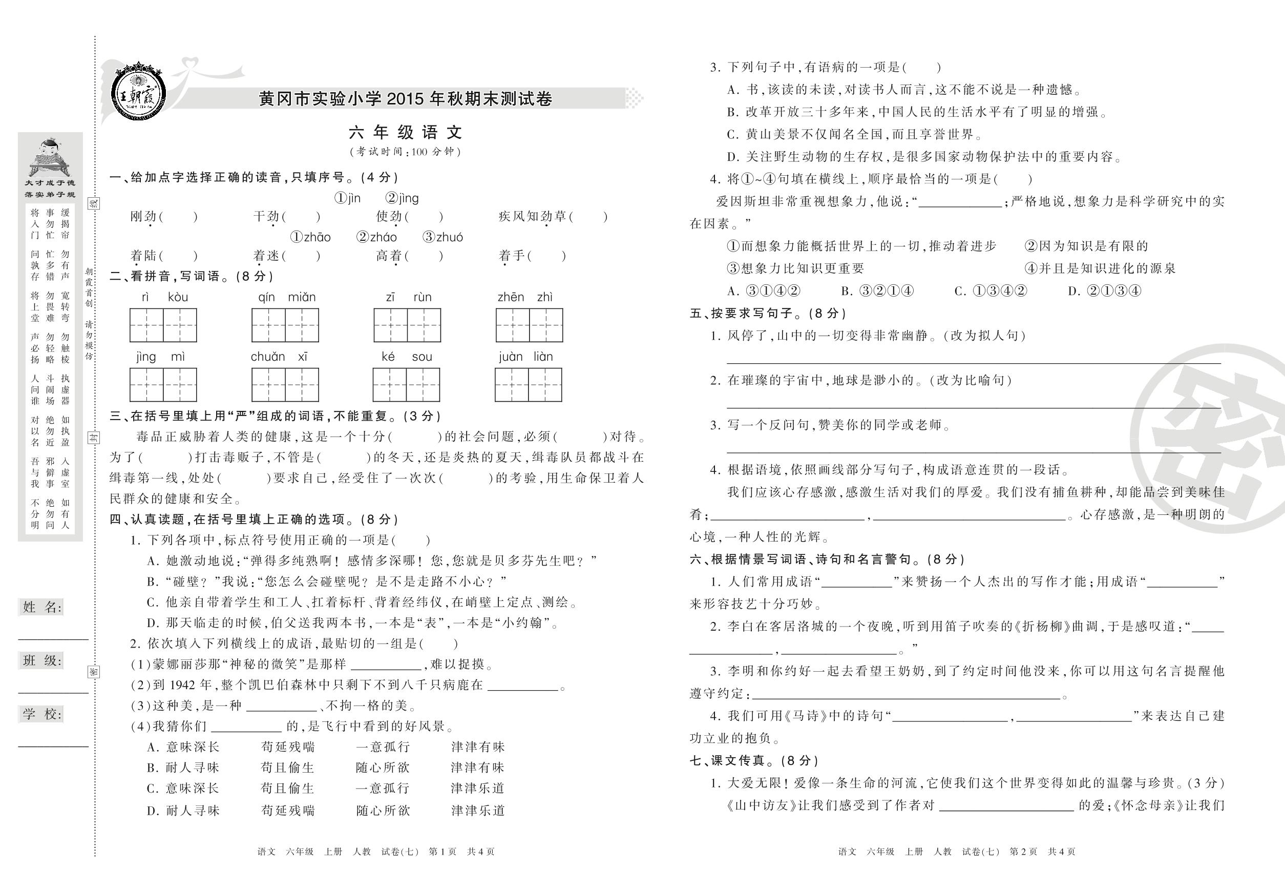 2015-2016学年第一学期黄冈市实验小学六年级语文试卷(人教版)【7】
