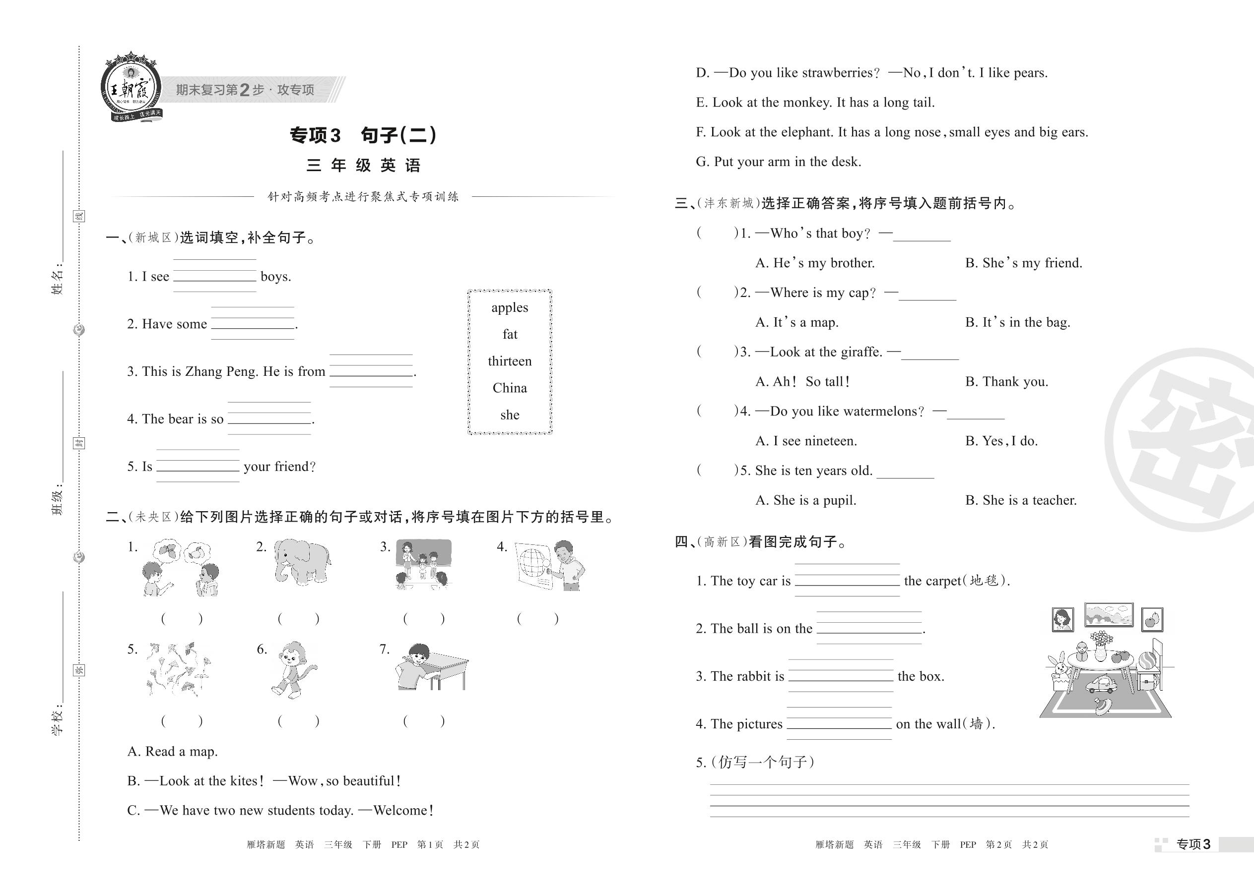 王朝霞期末专项卷——句子(二)三年级下册英语(PEP版)_R220329164504179【3】