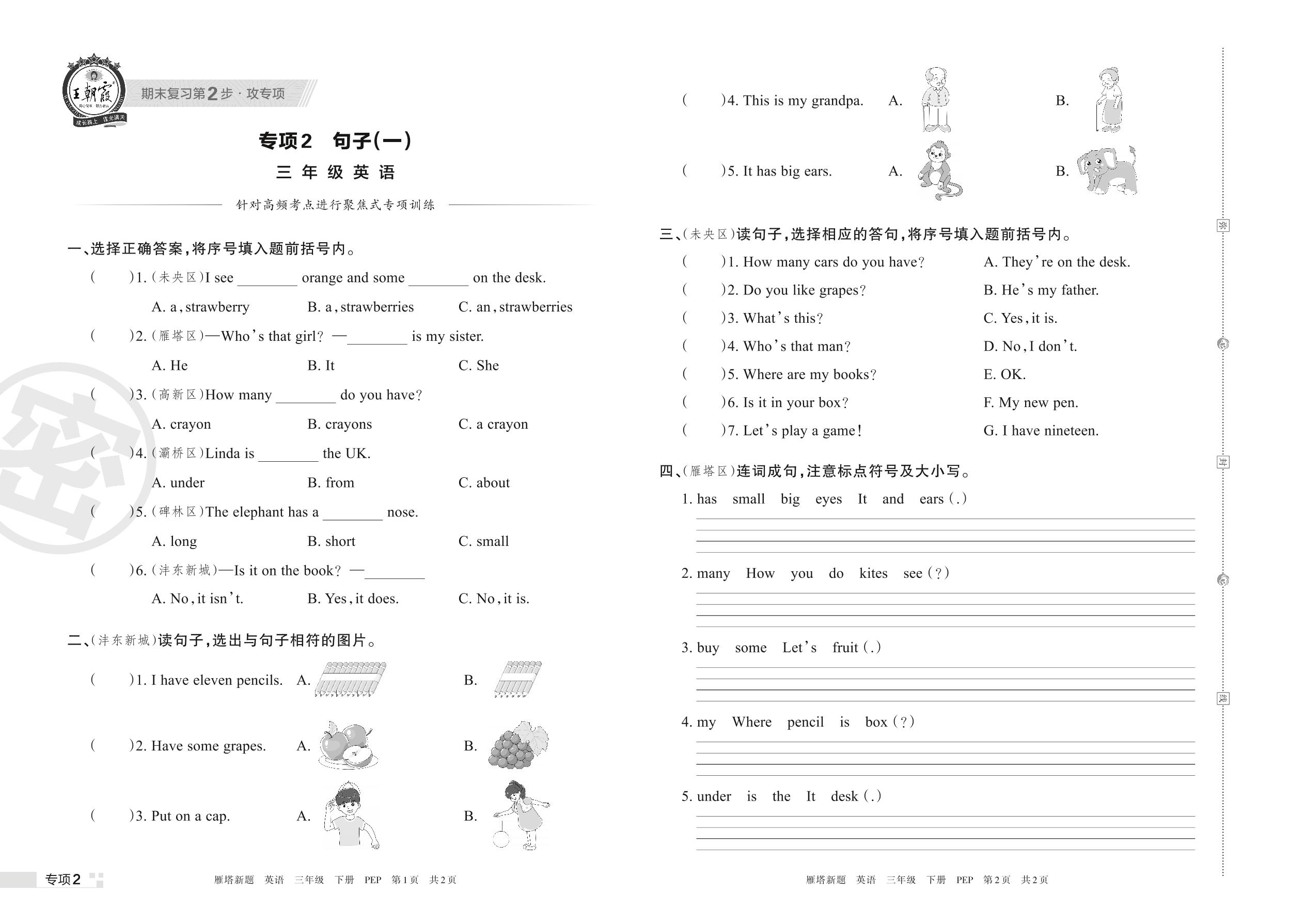 王朝霞期末专项卷——句子(一)三年级下册英语(PEP版)_R220329164504376【2】