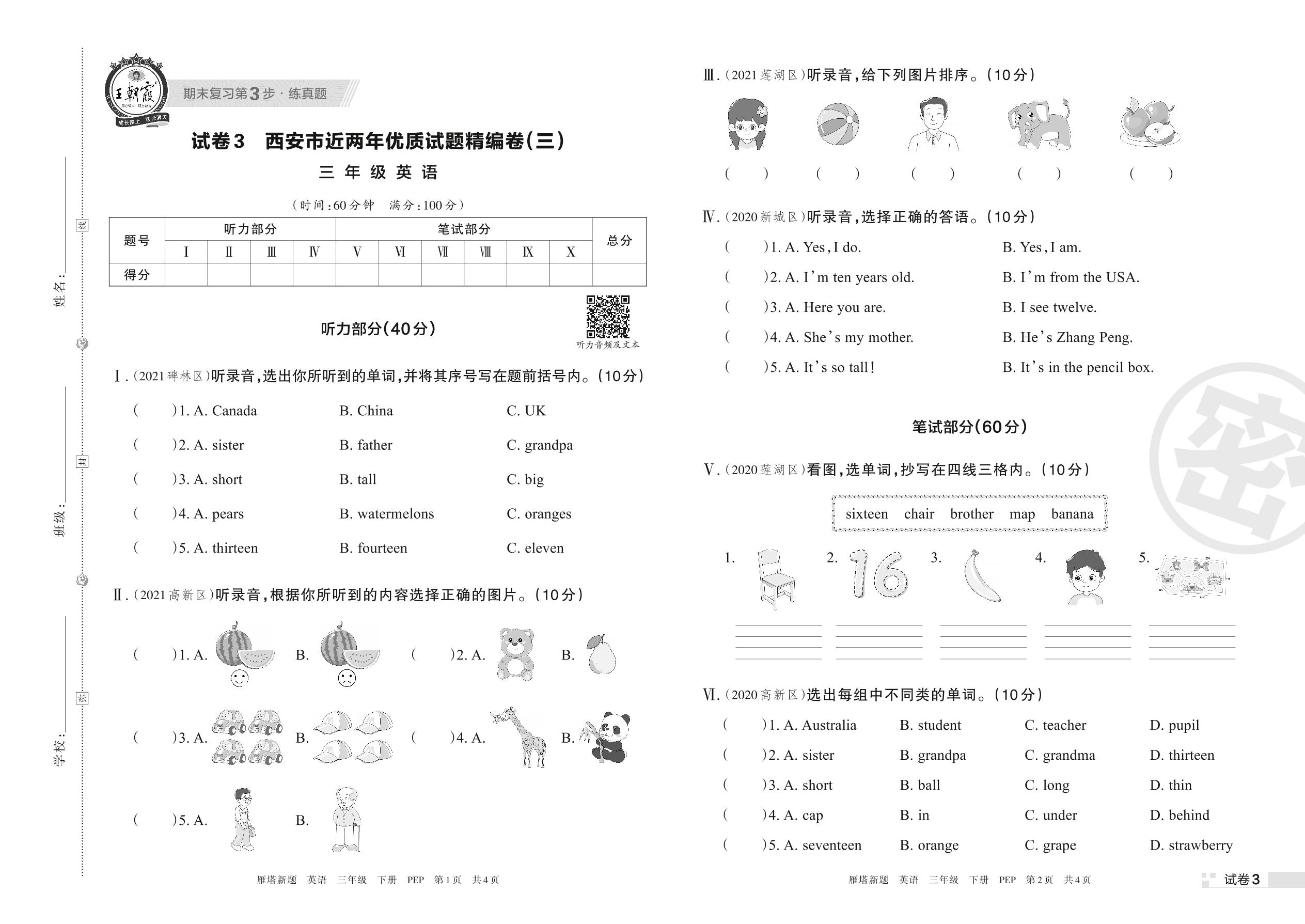 西安市近两年优质真题精编卷(三)三年级下册英语(PEP版)【3】