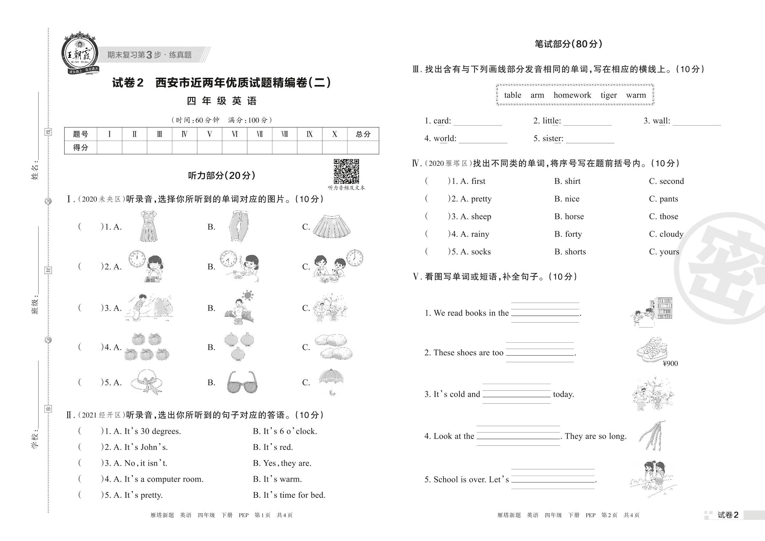 西安市近两年优质真题精编卷(二)四年级下册英语(PEP版)【2】
