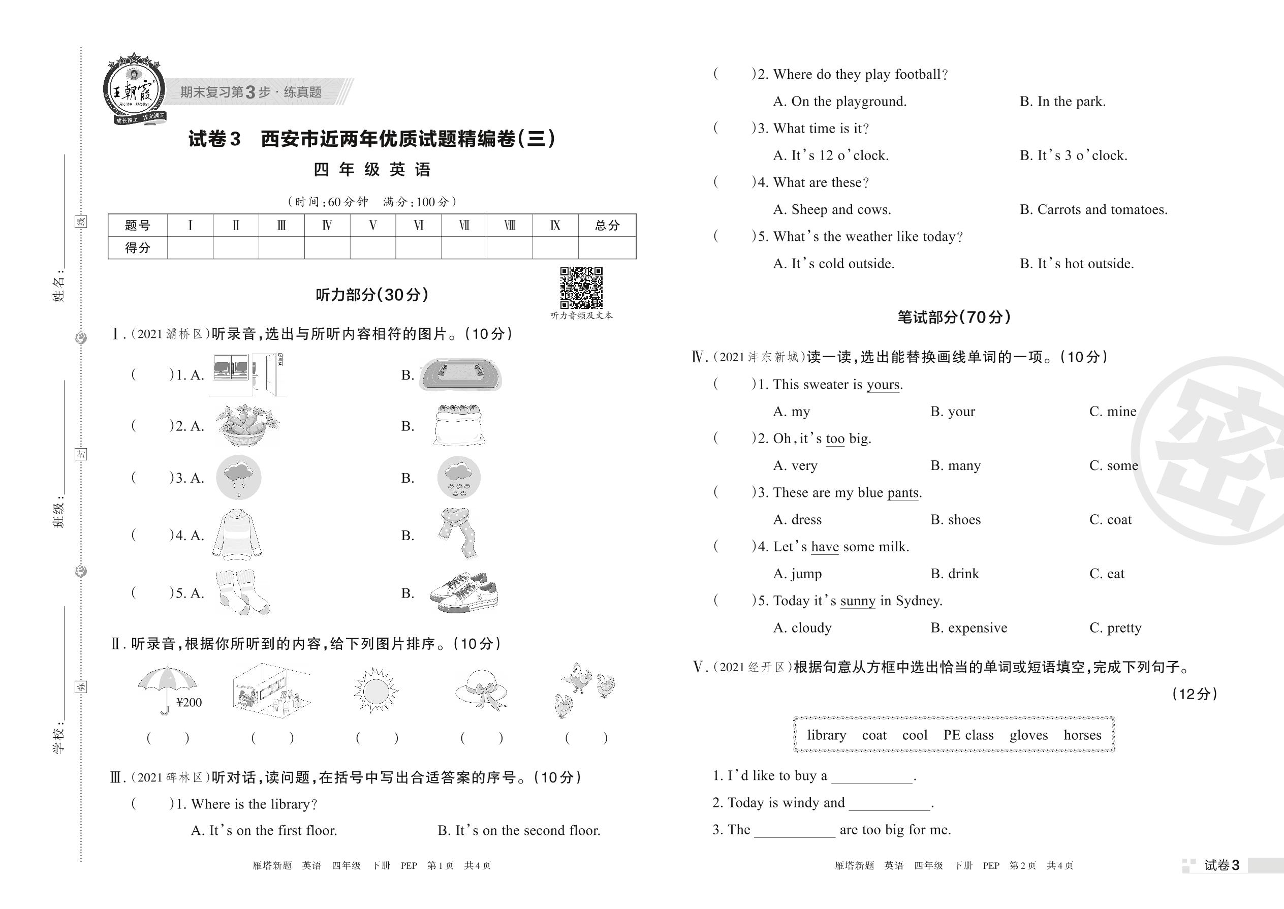 西安市近两年优质真题精编卷(三)四年级下册英语(PEP版)【3】