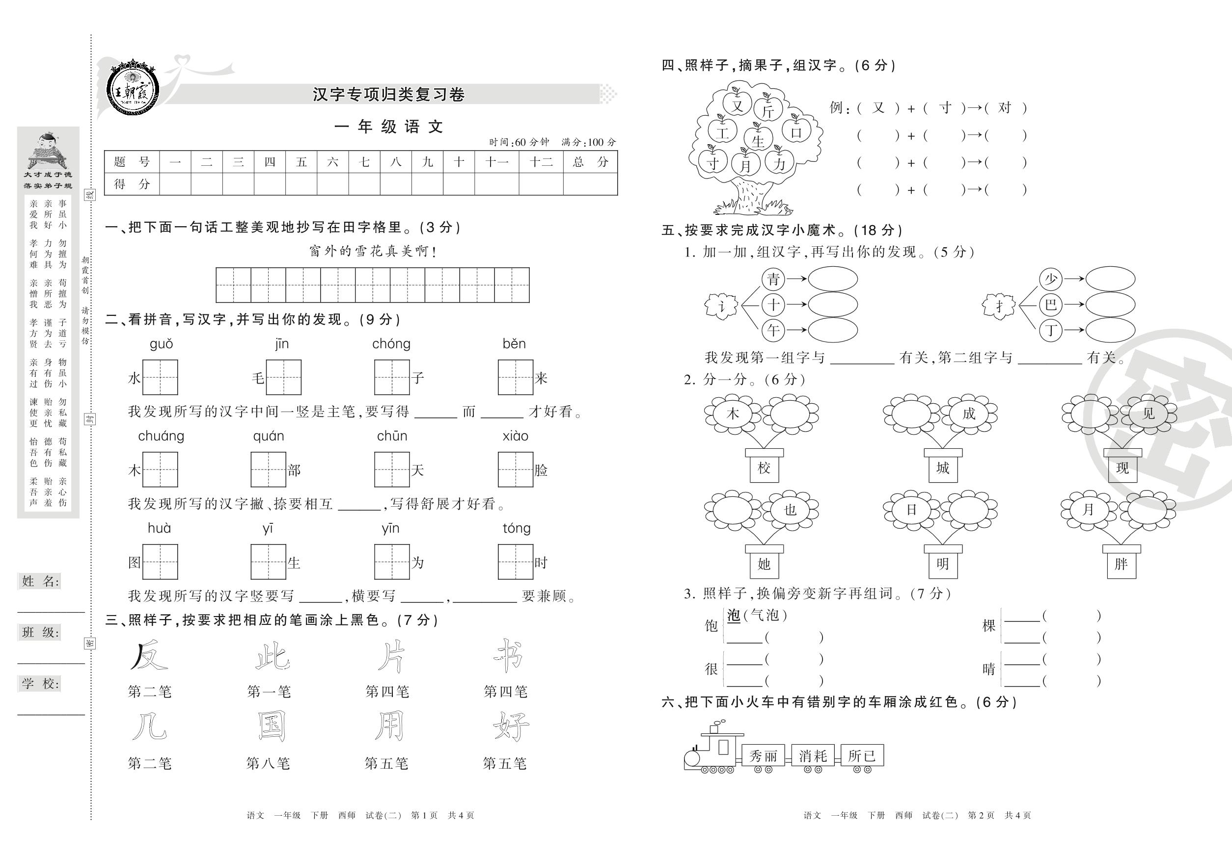 王朝霞期末专项卷一年级下册语文(西师版)_R210731183434【2】