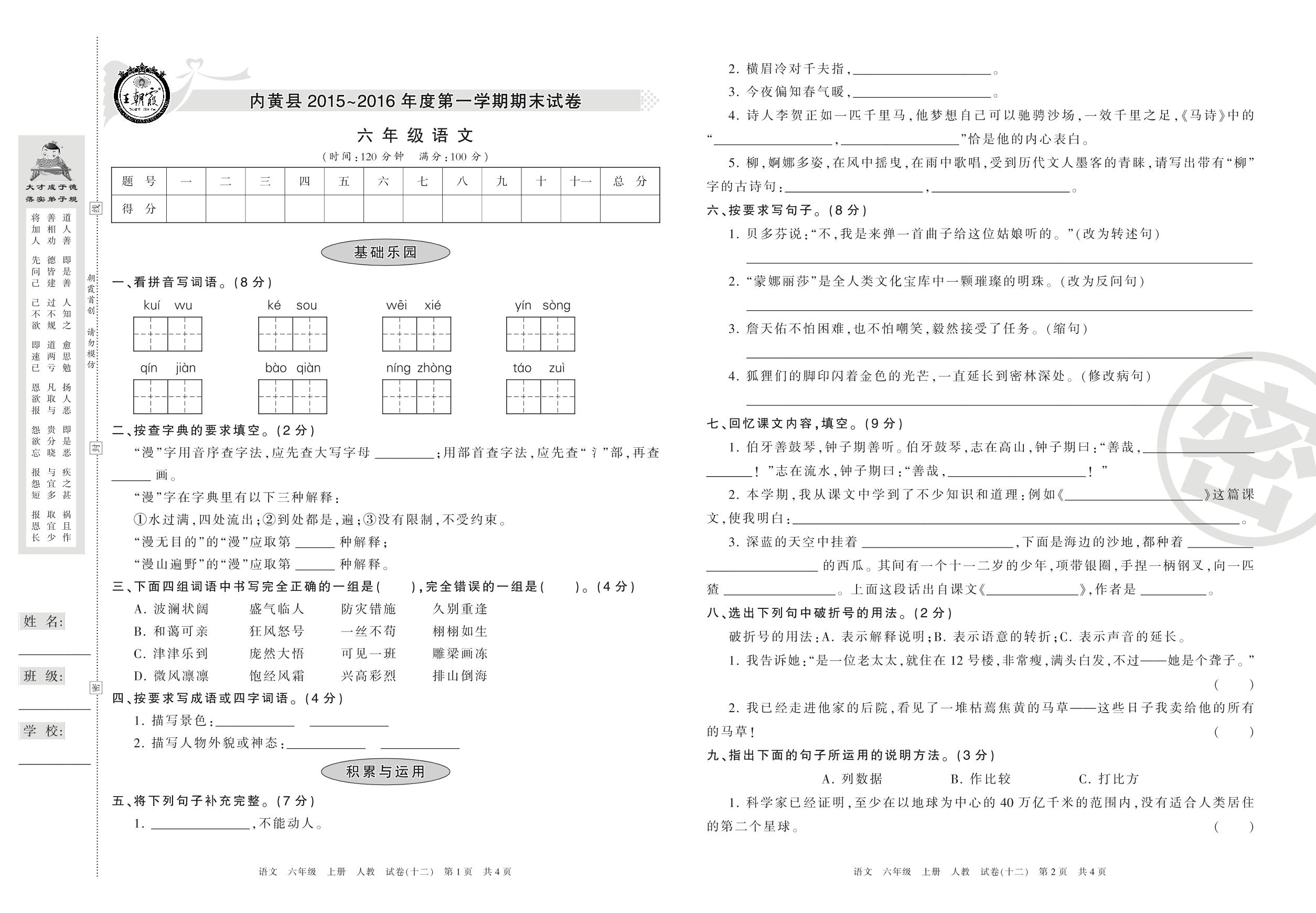 2015-2016学年第一学期安阳市内黄县六年级语文试卷(人教版)【12】