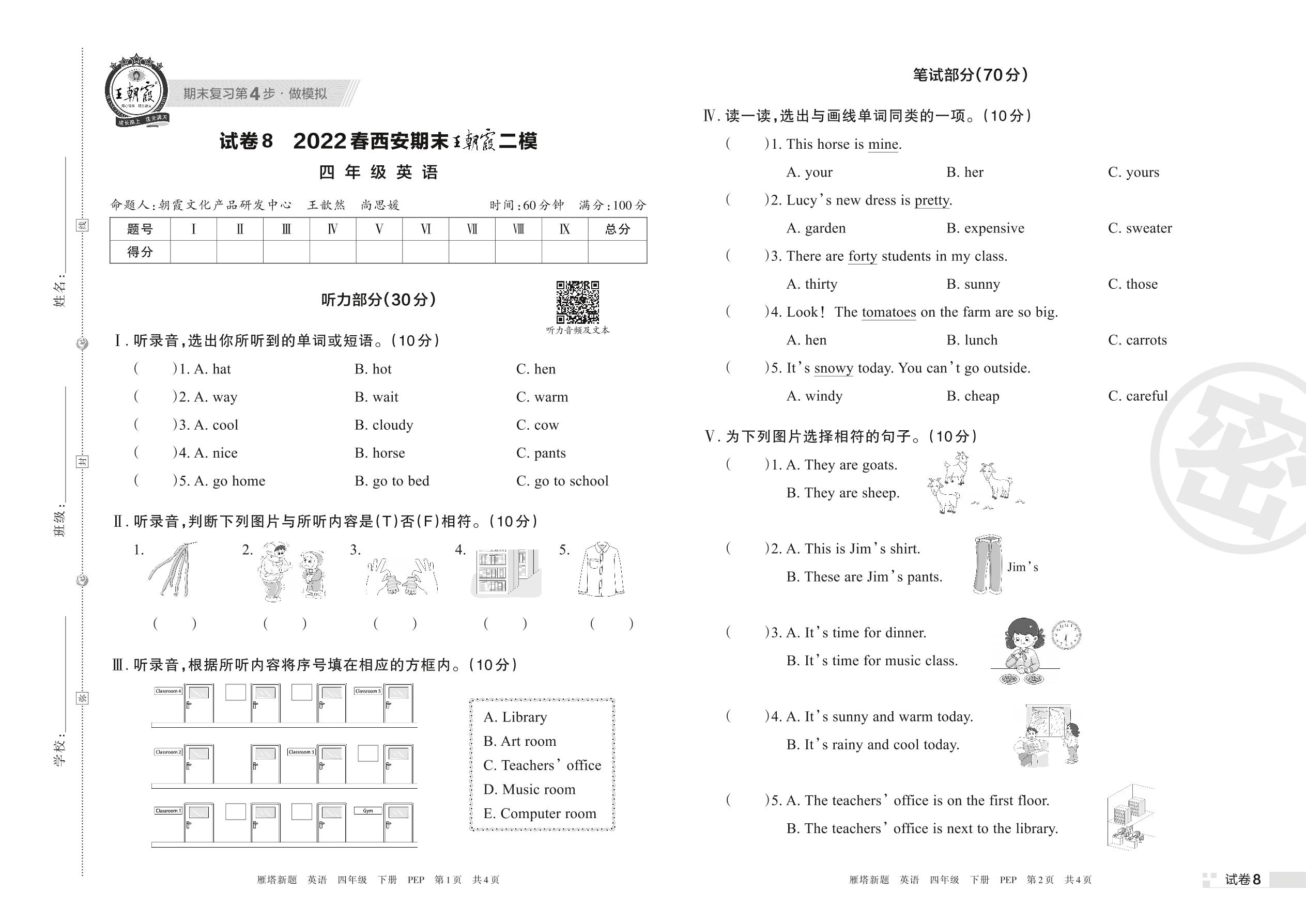 王朝霞期末模拟卷四年级下册英语(PEP版)_R220329165013001【8】