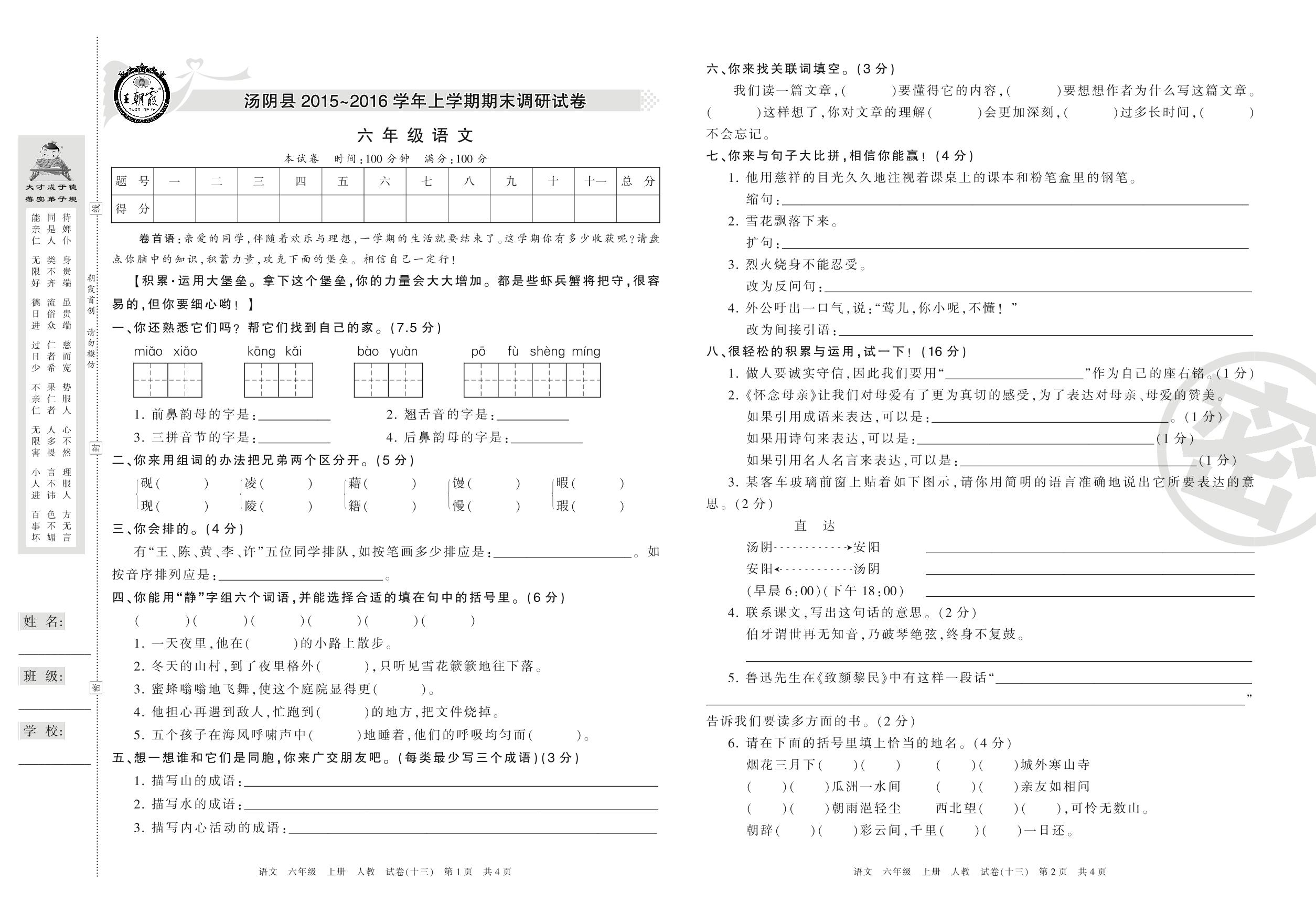 2015-2016学年第一学期安阳市汤阴县六年级语文试卷(人教版)【13】