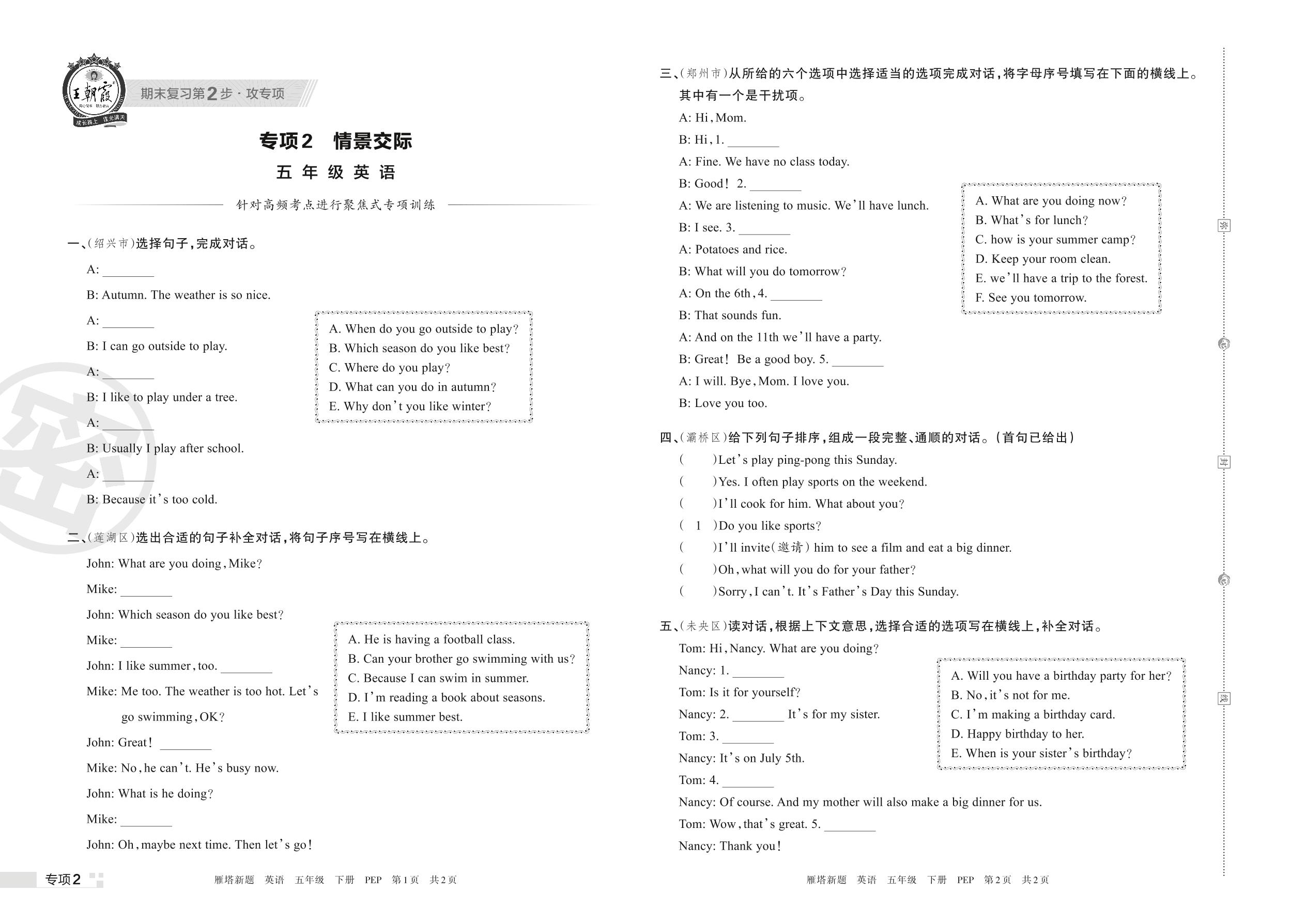 王朝霞期末专项卷——情景交际五年级下册英语(PEP版)_R220329165602000【2】