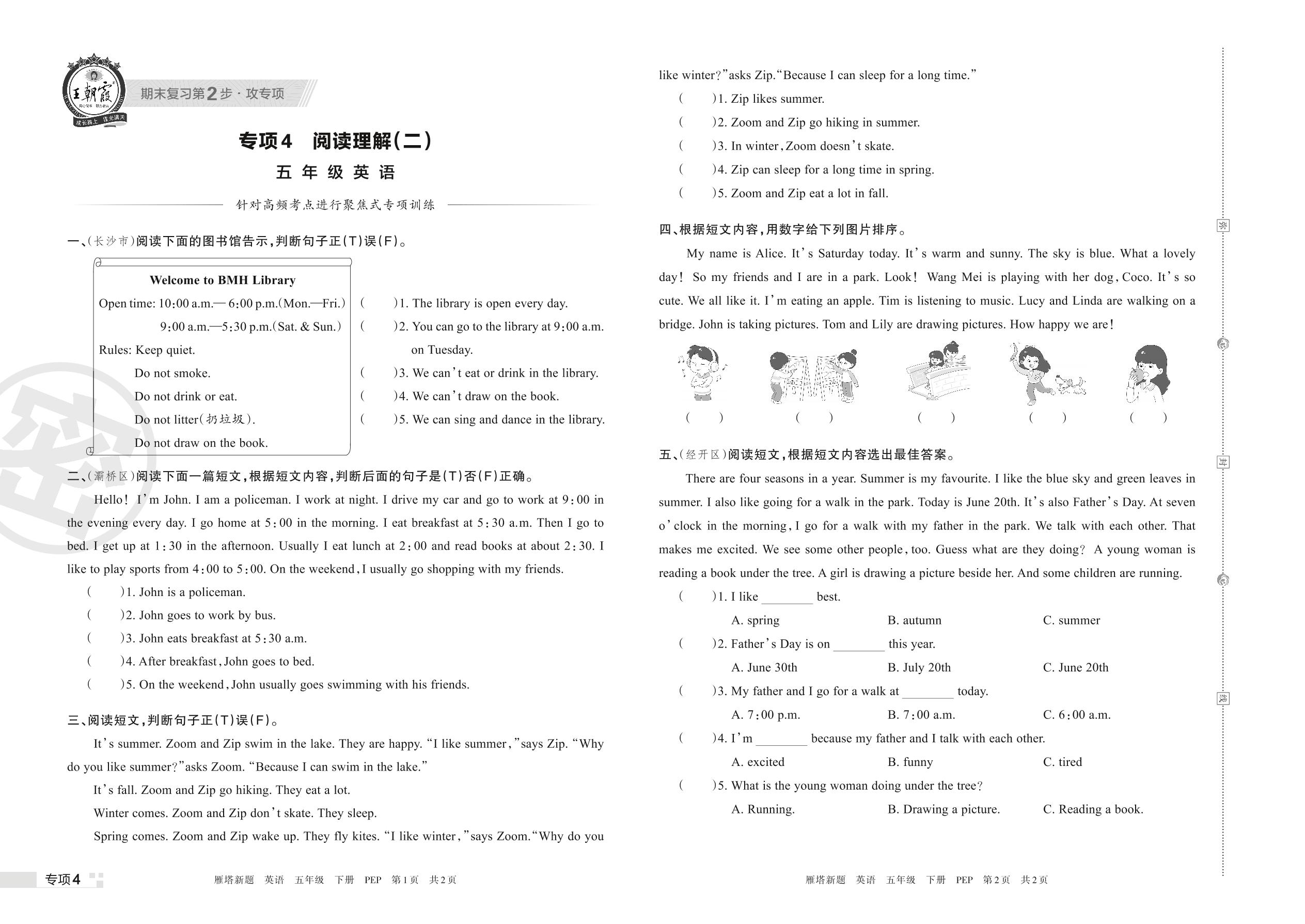 王朝霞期末专项卷——阅读理解(二)五年级下册英语(PEP版)【4】