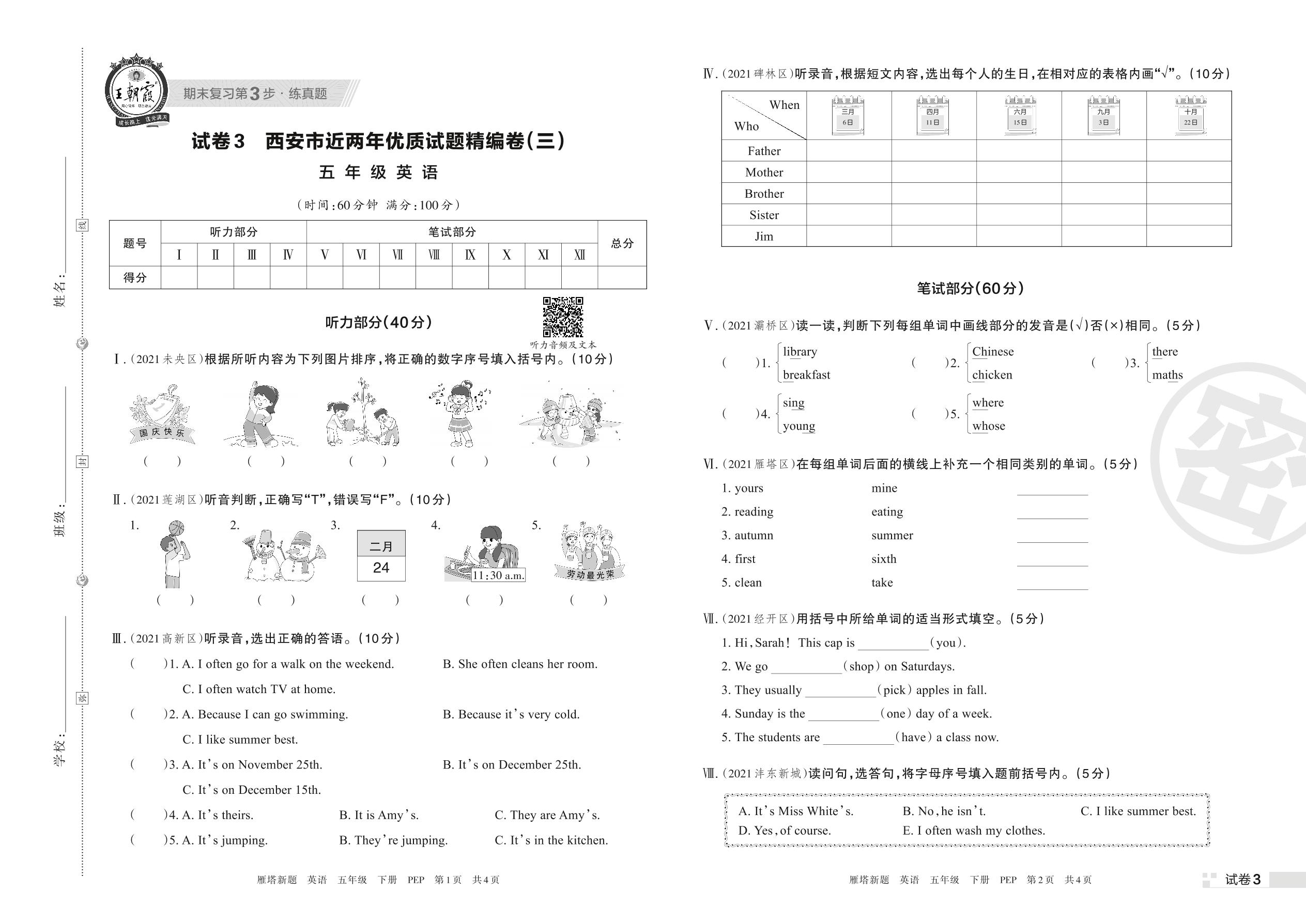 西安市近两年优质真题精编卷(三)五年级下册英语(PEP版)【3】