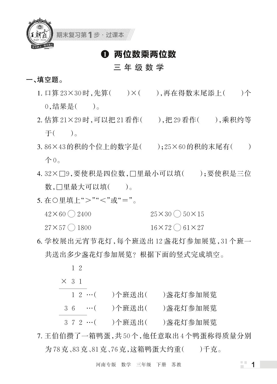 王朝霞期末过课本——1 两位数乘两位数三年级下册数学(苏教版)_R220329165951940