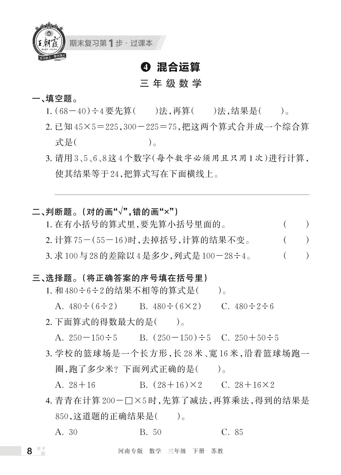 王朝霞期末过课本——4 混合运算三年级下册数学(苏教版)_R220329165952755