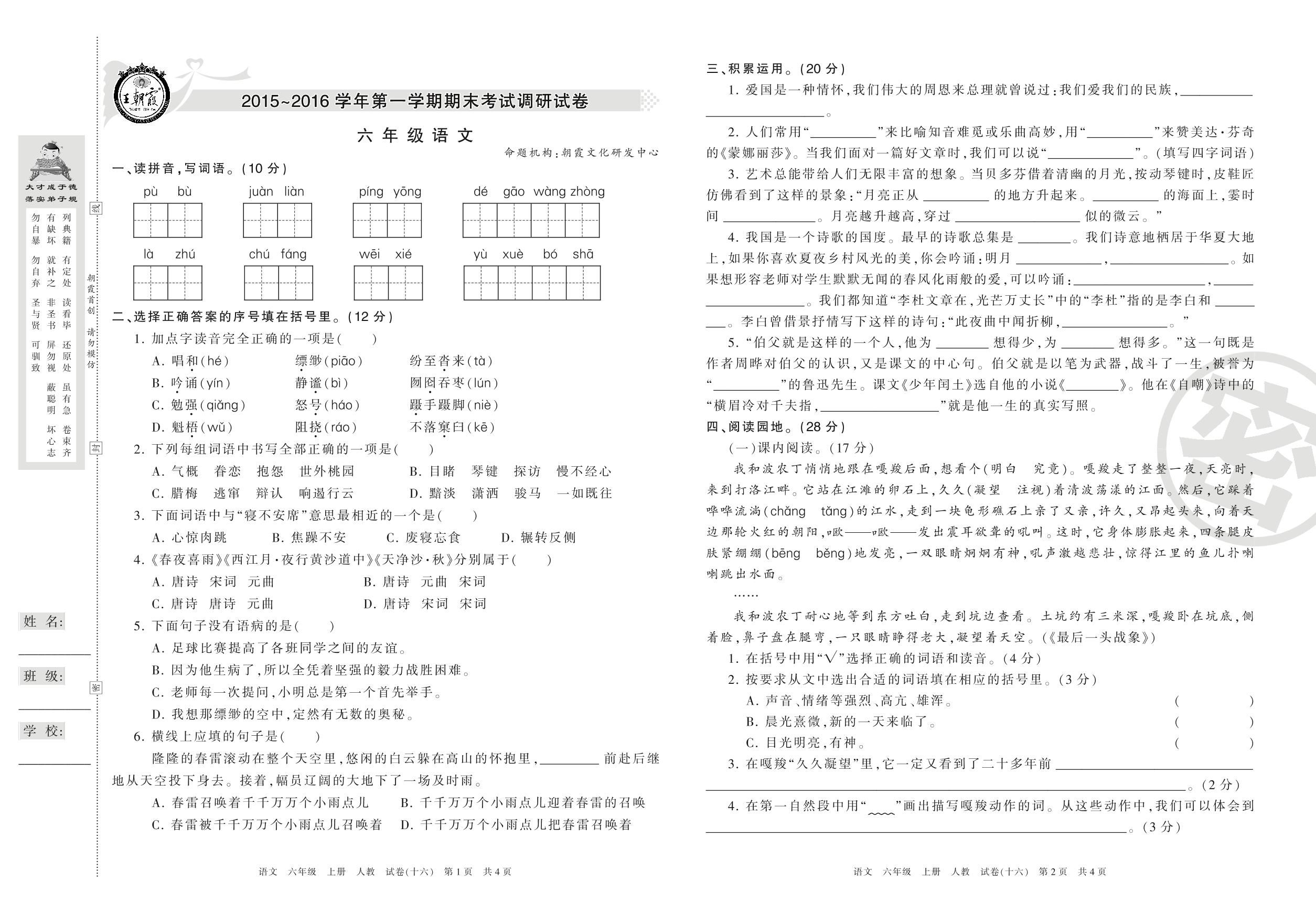 王朝霞期末调研卷六年级上册语文(人教版)【16】