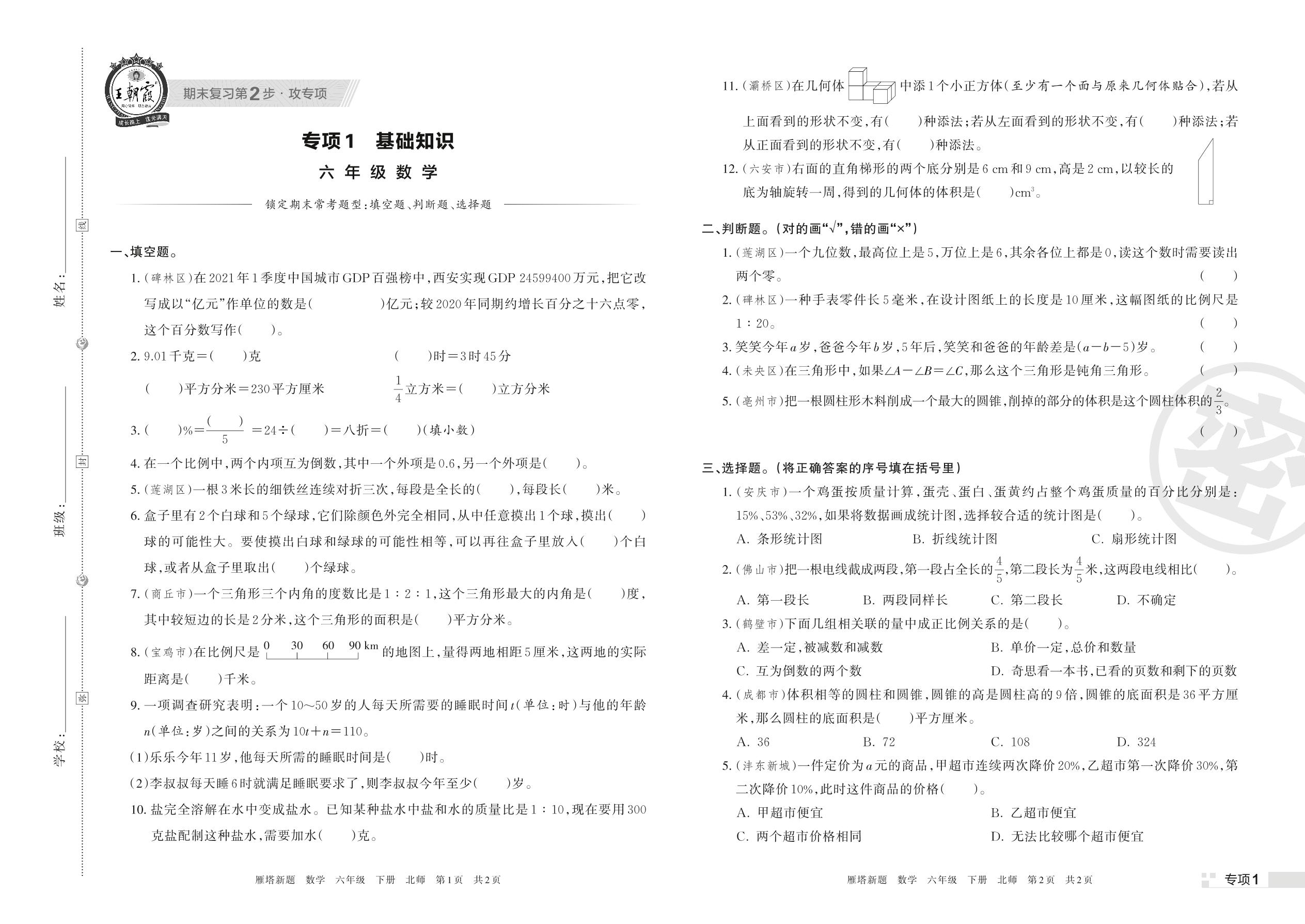 王朝霞期末专项卷——基础知识六年级下册数学(北师版)_R220329170053766【1】