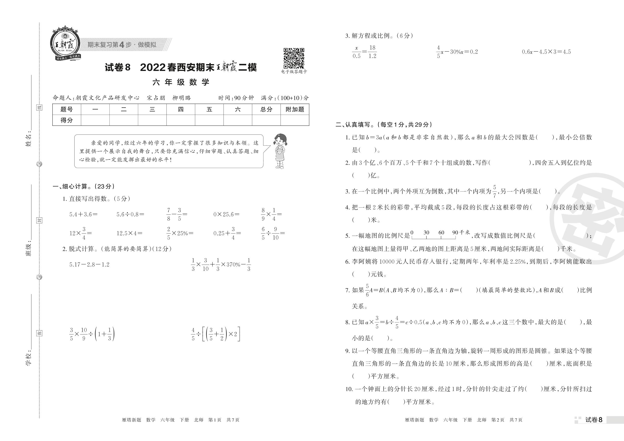 王朝霞期末模拟卷六年级下册数学(北师版)_R220329170054406【8】