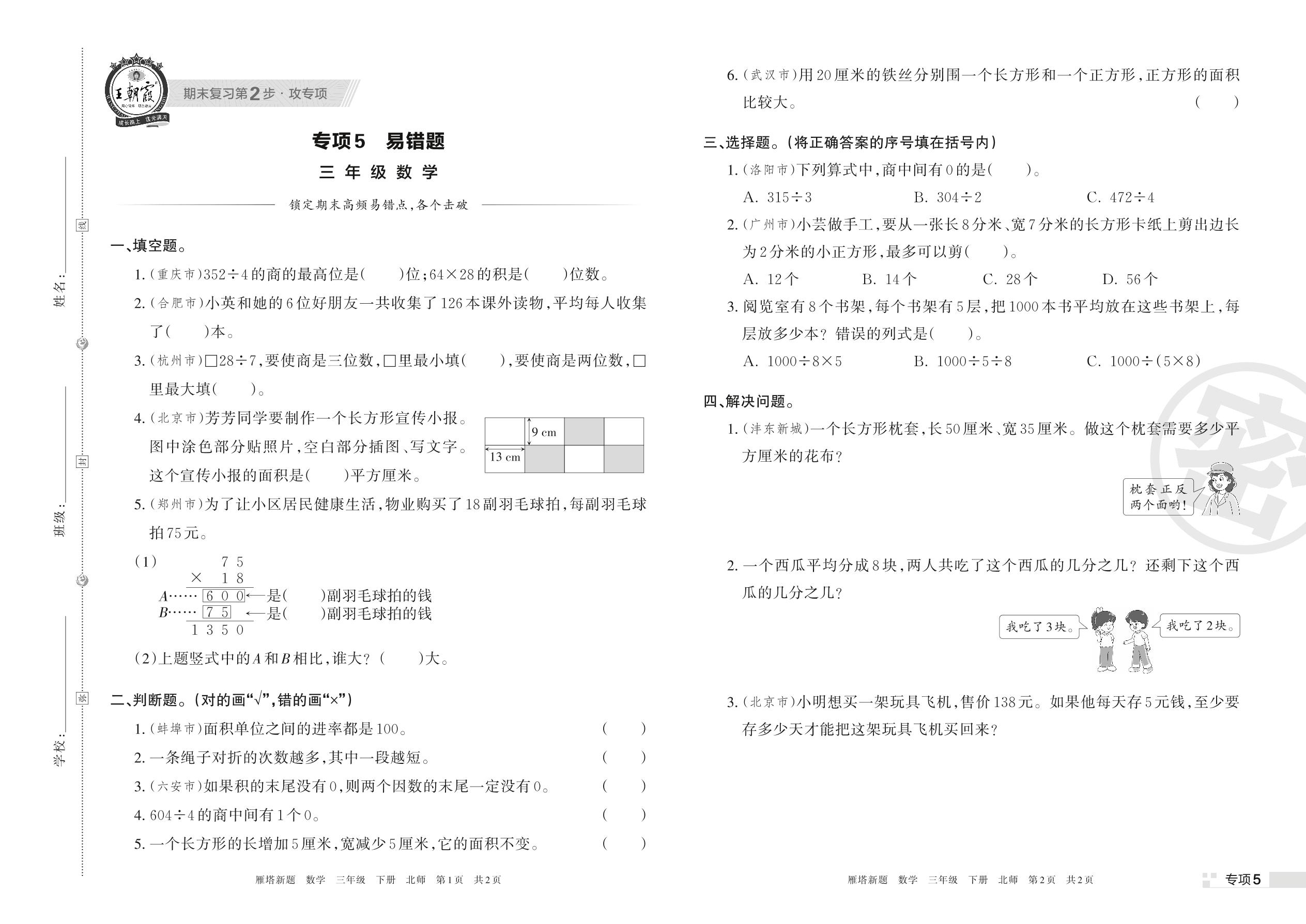 王朝霞期末专项卷——易错题三年级下册数学(北师版)_R220329170701000【5】