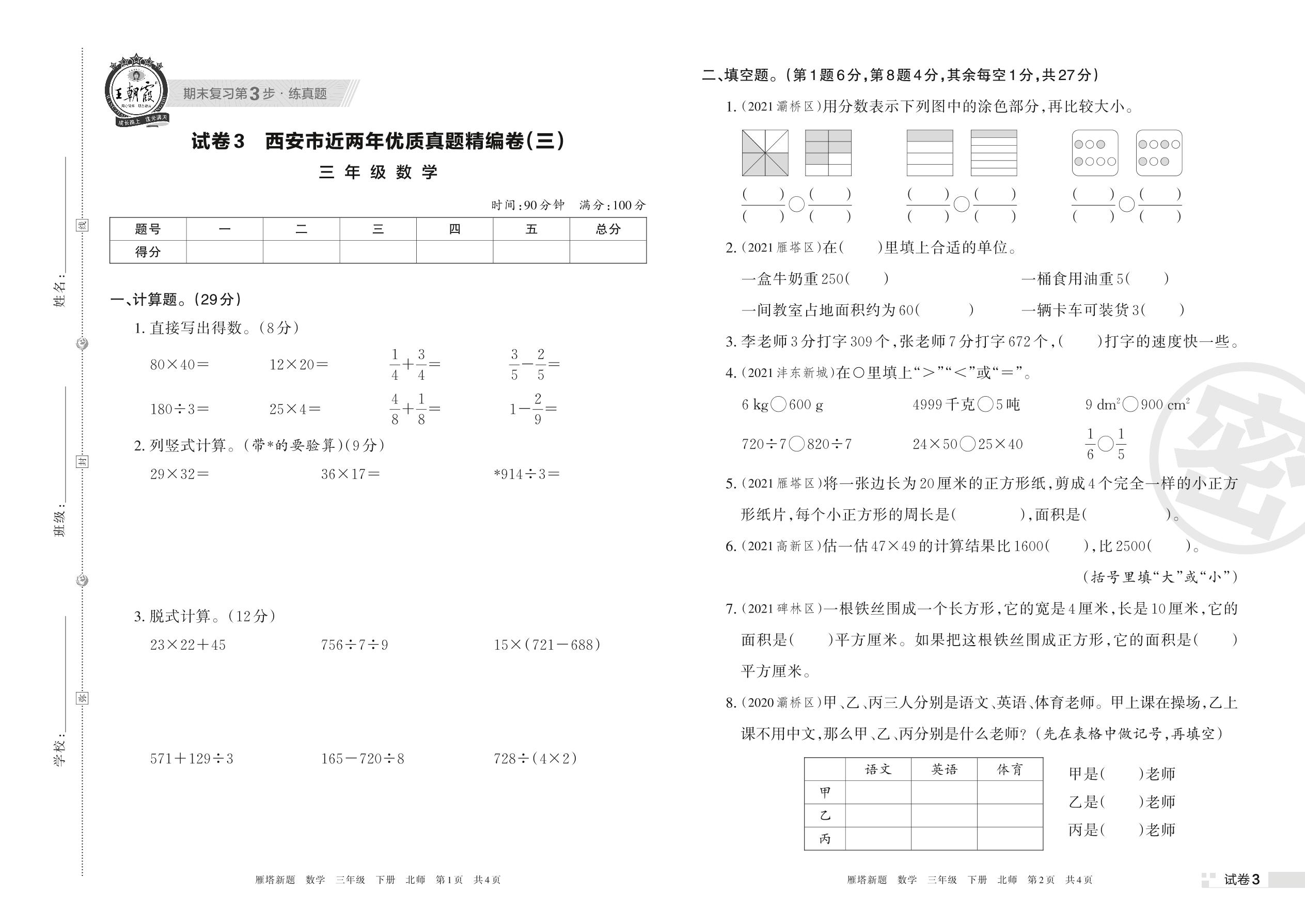 西安市近两年优质真题精编卷(三)三年级下册数学(北师版)【3】