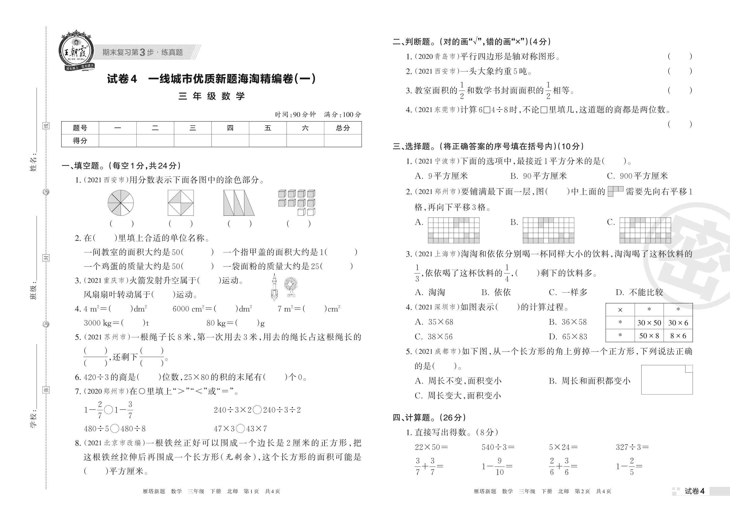 一线城市优质新题海淘精编卷(一)三年级下册数学(北师版)【4】