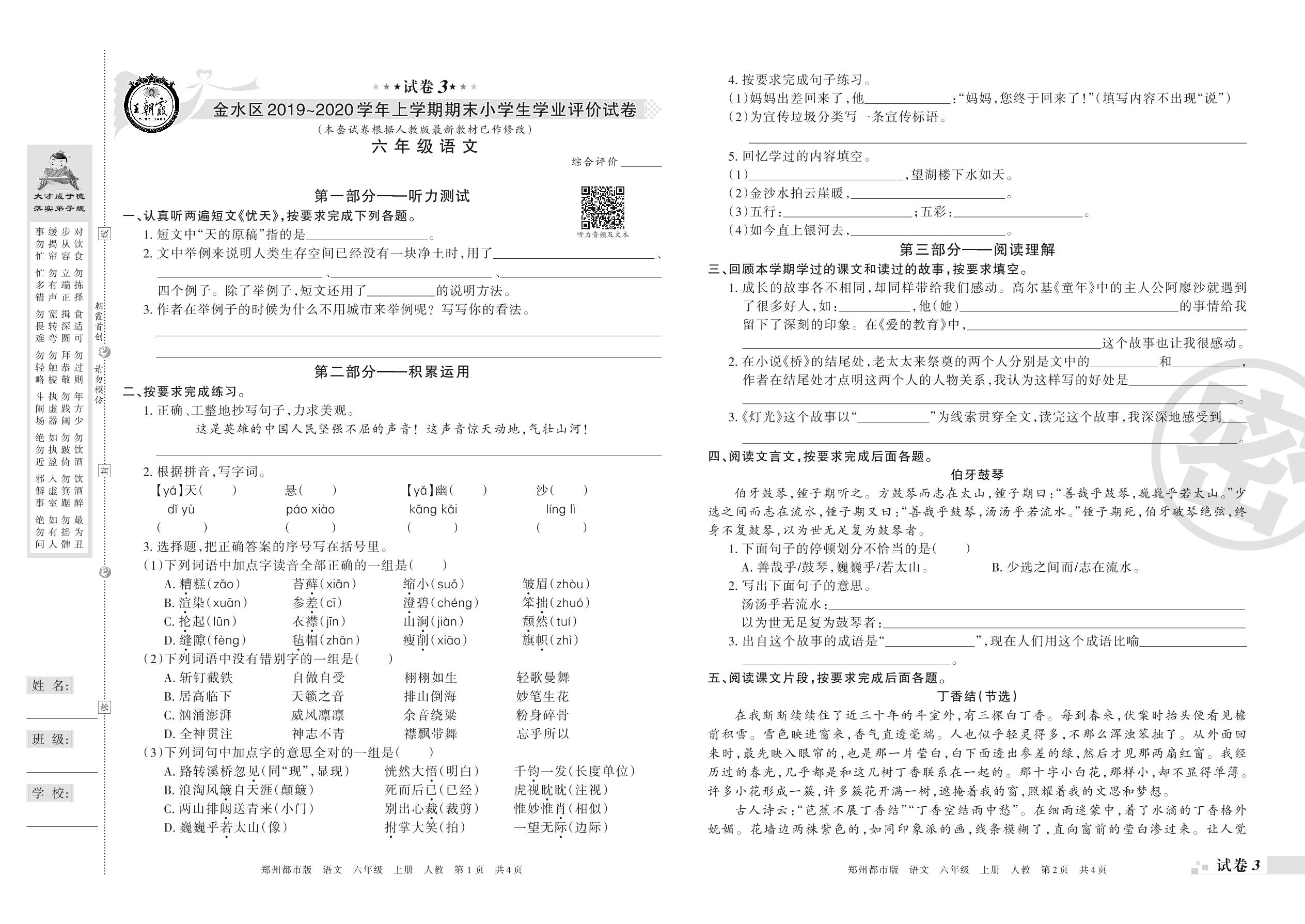 2019-2020学年第一学期郑州市金水区六年级语文试卷(人教版)【3】