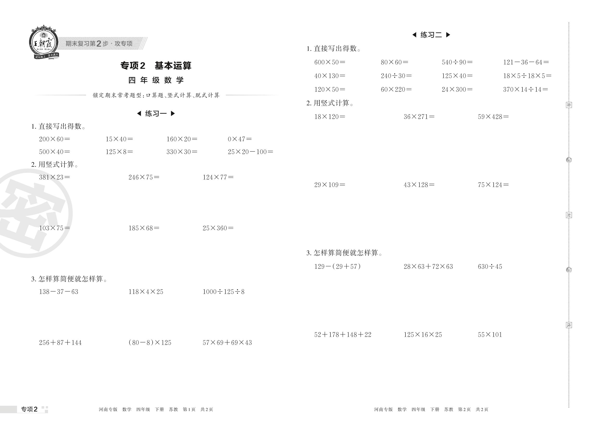 王朝霞期末专项卷——基本运算四年级下册数学(苏教版)_R220329170751789【2】