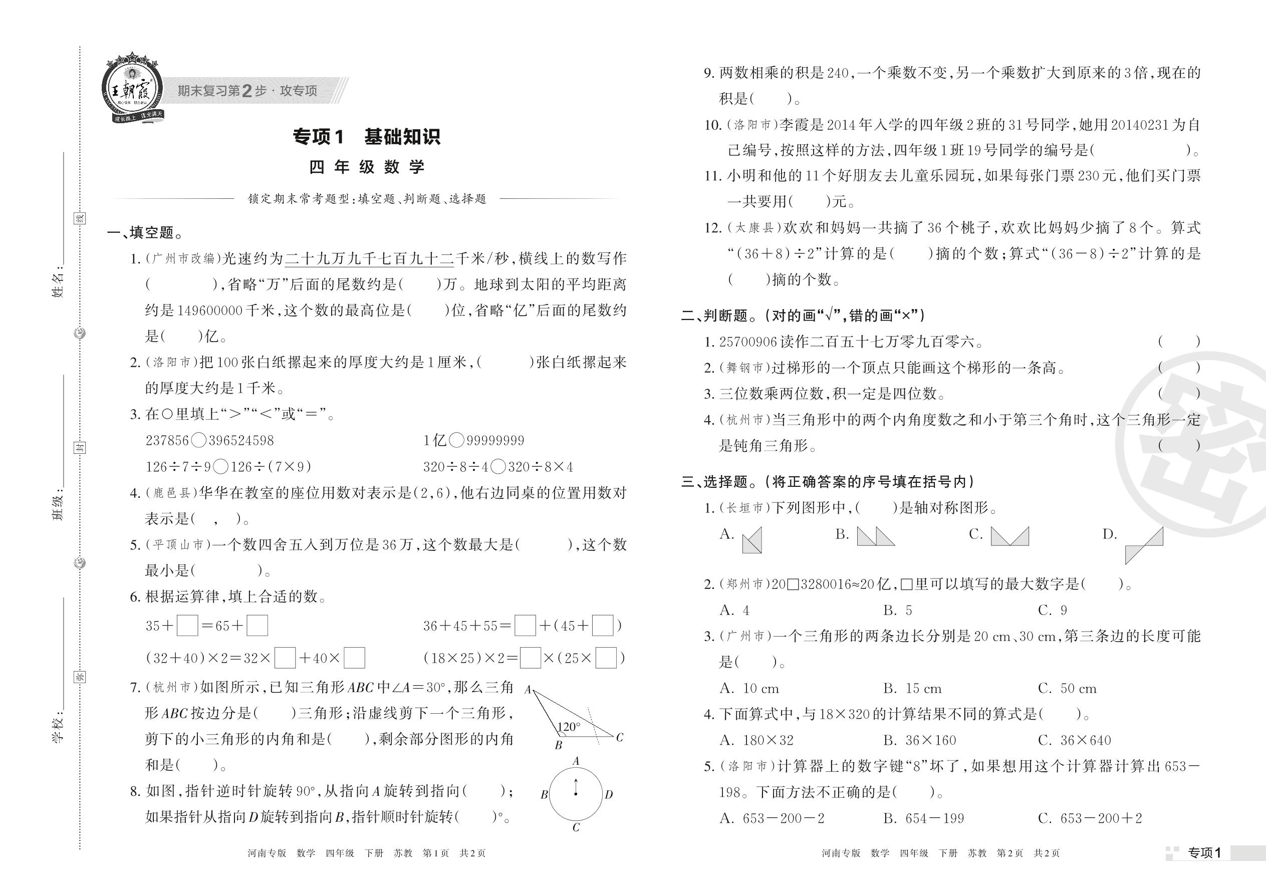 王朝霞期末专项卷——基础知识四年级下册数学(苏教版)_R220329170751546【1】