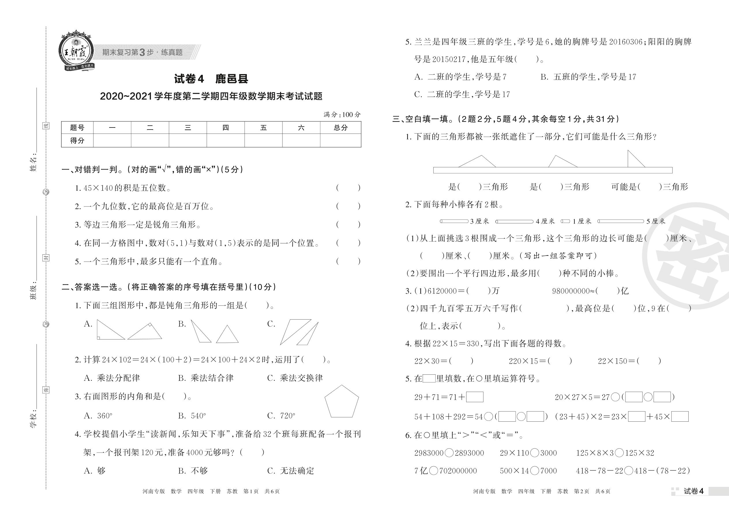 鹿邑县2020~2021学年度第二学期四年级数学期末考试试题(苏教版)【4】